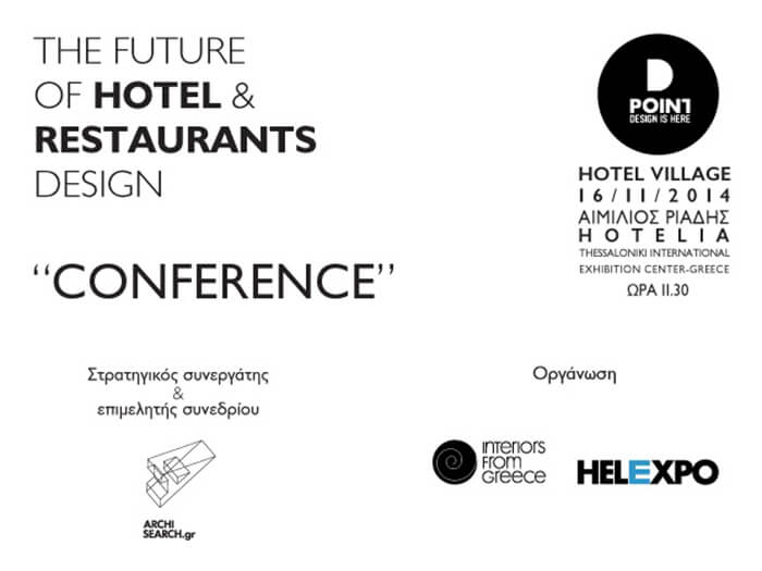 The past weekend, 15-16 of November, a conference took place in the International Trade Fair of Thessaloniki. The theme was Hotel Design and several designers and architects explained the perspective of the architectural design in the field of tourism in Greece. The exhibition’s name was “Hotelia 2014” and there was also a second one about industrial design, Philoxenia in which six designers-architects presented their work.