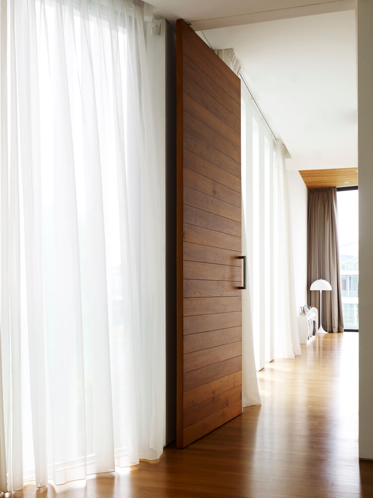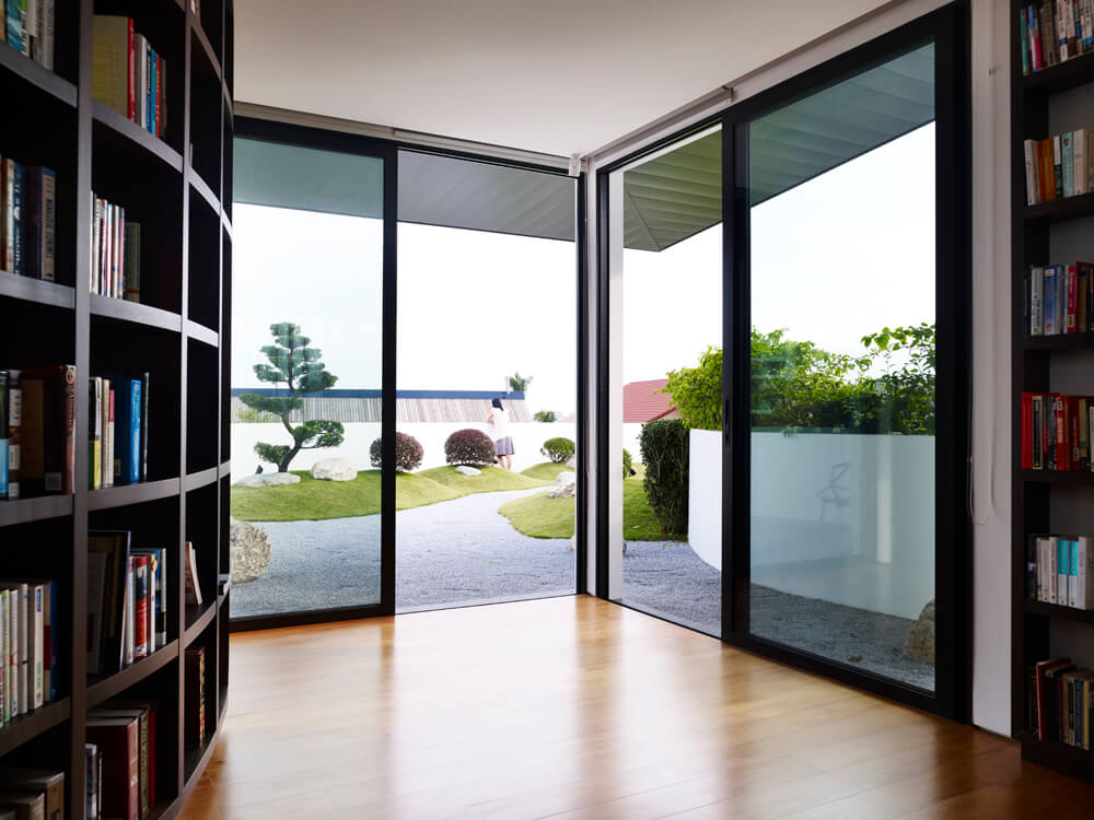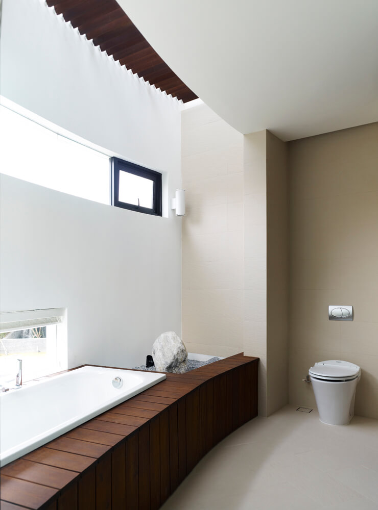 Within the boomerang-shaped house, Aamer further introduced at least two types of variations. In terms of elevational articulation, Aamer treated the two sides of the boomerang in a contrasting manner. For the curved side that faces the street front, it was expressed in a comparatively opaque and enclosed manner – in the first storey, it is a solid stone-cladded wall with narrow vertical slits, and in the second storey, it is a solid plastered wall, punctuated by small horizontal slits, that peels off from the main volume of the house. On the other side, the house opens toward the waterfront in a much more transparent and open manner through glass enclosure, timber deck and balconies.