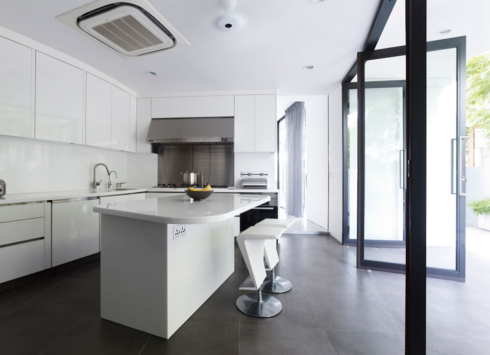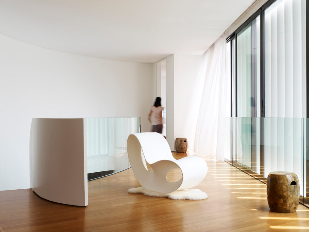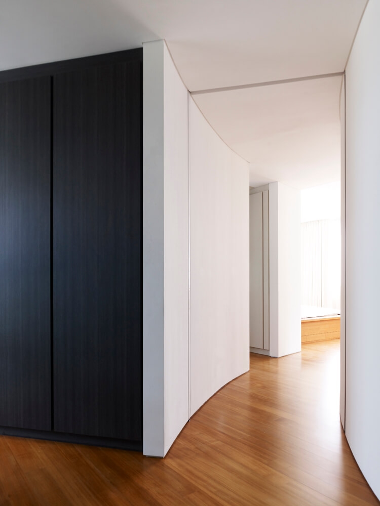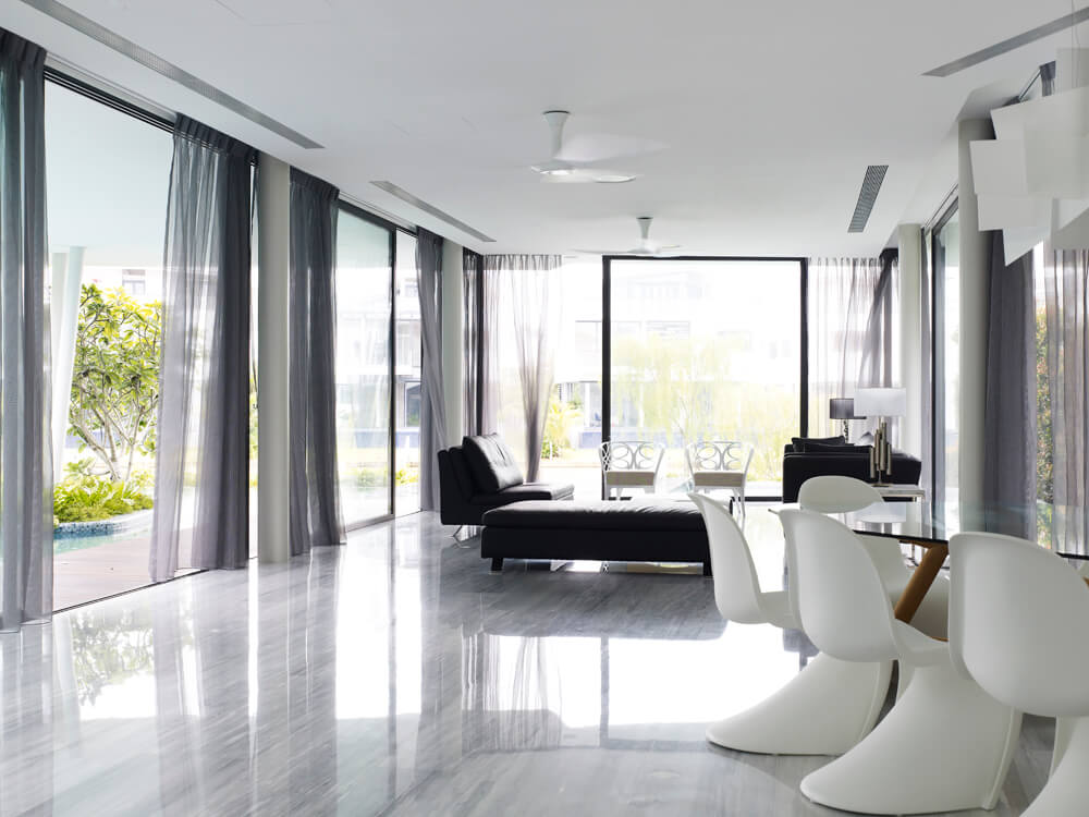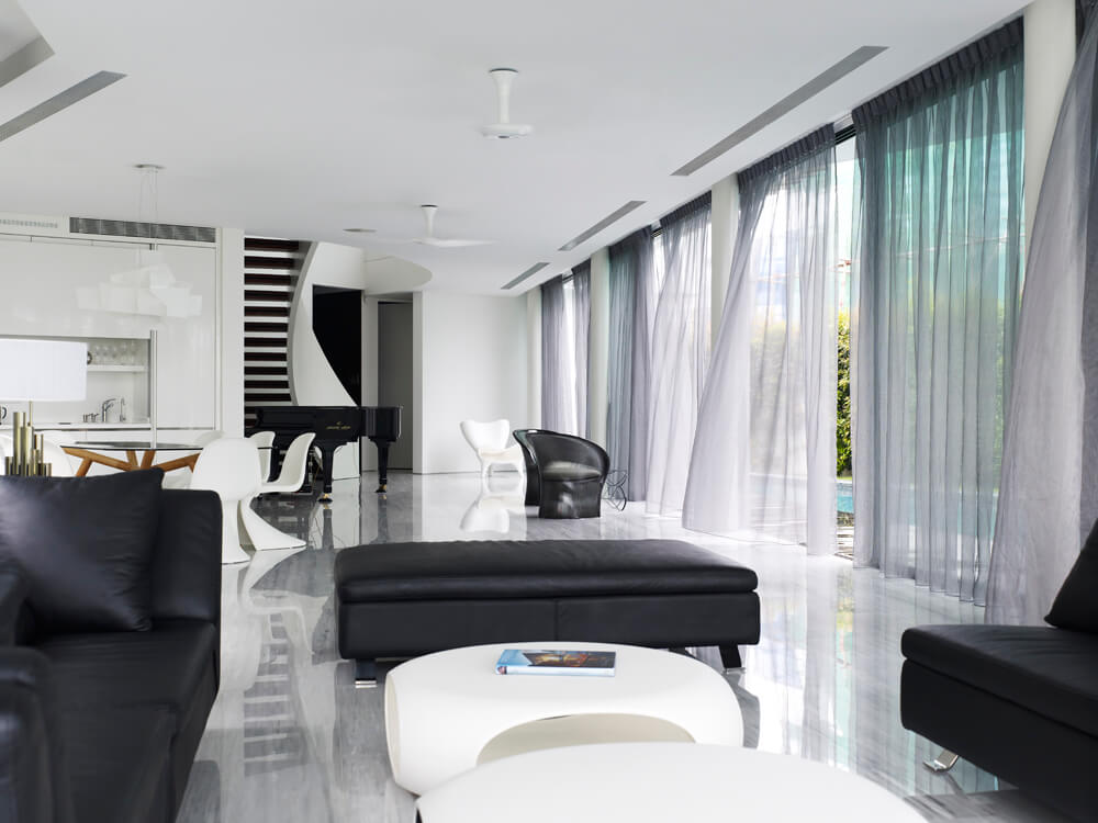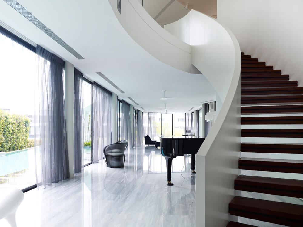 The site is narrow and long, with a small frontage to the waterfront. To maximize the view to the waterfront, Aamer designed the house to curve like a boomerang so that all the bedrooms could have views of the waterfront. The geometry also allowed a twenty-five metre lap pool to be incorporated on one side at the ground level. This lap pool continues as a water feature that wraps around the living and dining spaces. Aamer also designed the main spaces of the first storey to be fluid and continuous so that, upon entry, one could see the waterfront straightaway. The connection to the waterfront is further reinforced by a linear timber deck that extends from the house into the pier. The clients also felt that such a spatial articulation gives the house a sense of spaciousness and makes it appear to be much bigger than many other rectilinear houses on similar plots at Cove Grove, Sentosa.
