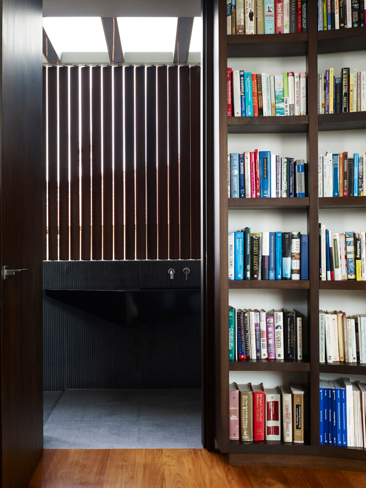 Aamer also varied the spaces of the house by section. In the first storey, the living and dining spaces were expressed as one fluid, continuous entity surrounded by water features and landscaping, while in the second storey, the spaces are compartmented into different bedrooms with their attached bathrooms and pockets of in-between spaces. In the third storey, Aamer inserted a pavilion that serves as the home office cum study for the clients, who work from home, and surrounded it with a contemplative roof garden.
