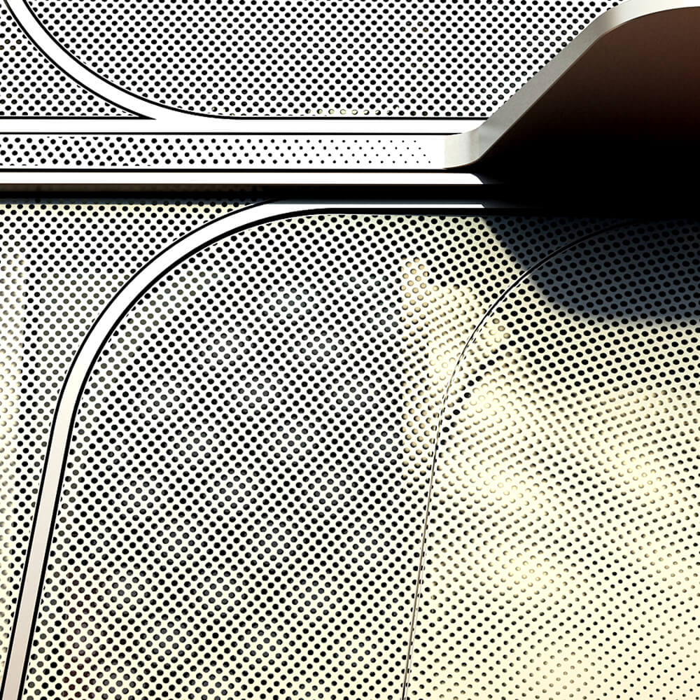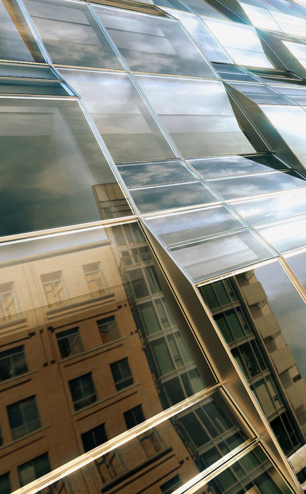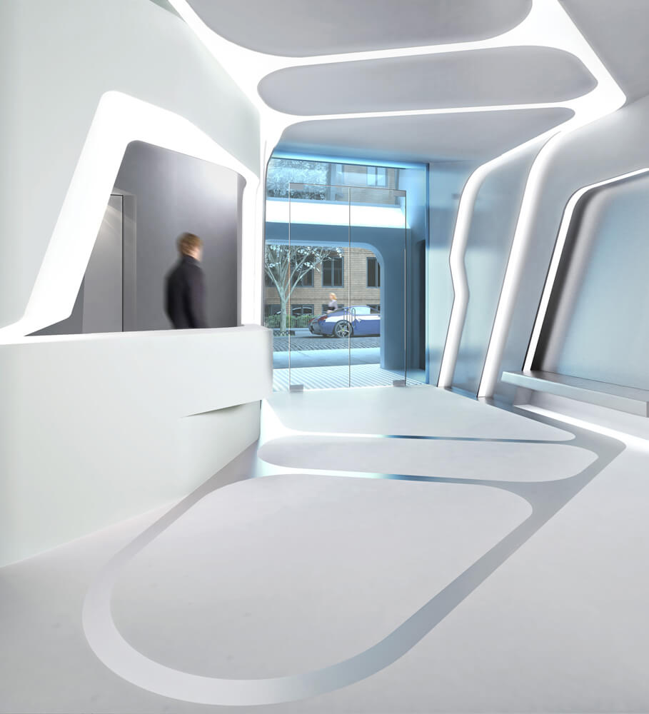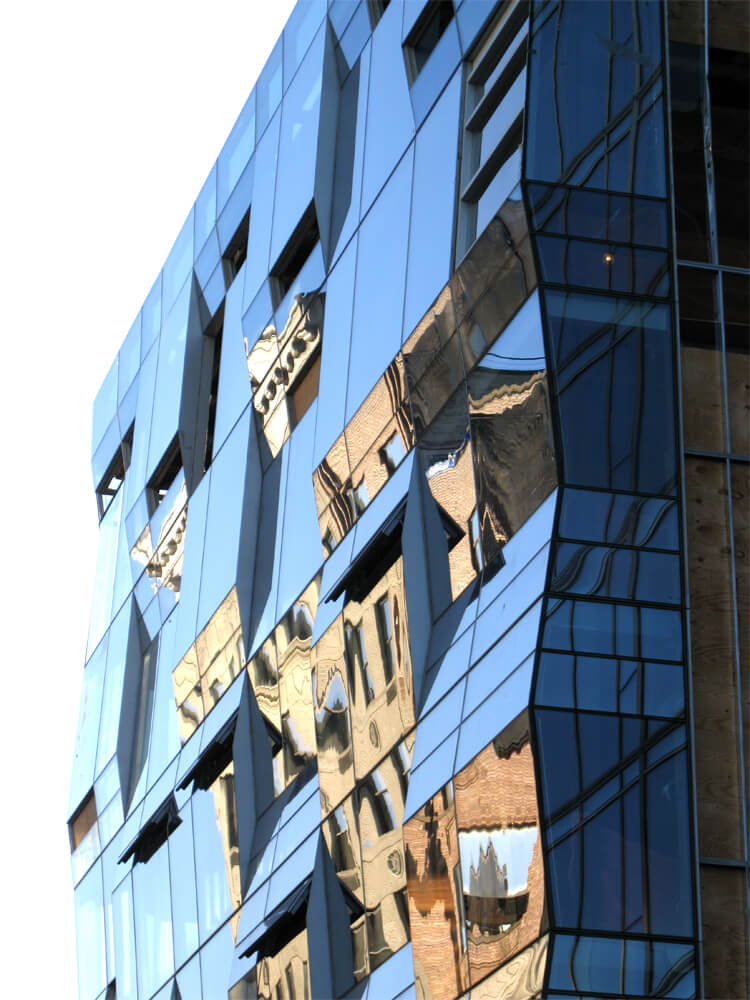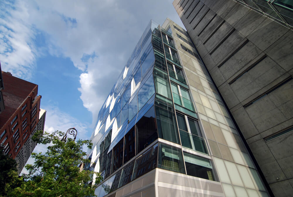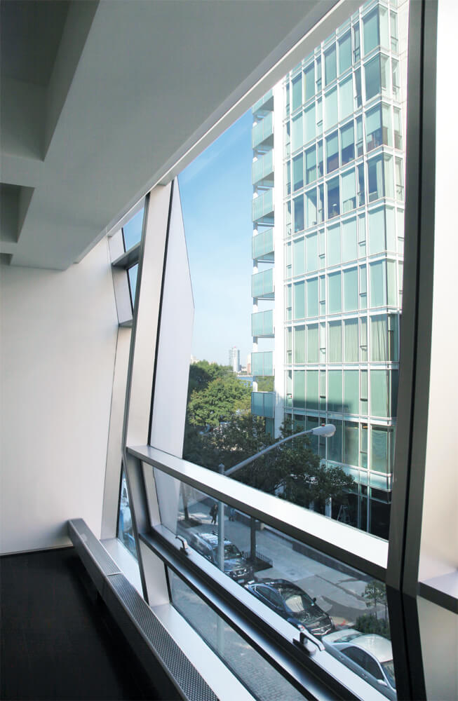 On the building’s exterior carefully angled glass panels form surfaces on the building’s façade that enhance the visual effects of the surrounding environment. The facade’s treatment allows for the dematerialized quality of reflections and the modulating qualities of light to prevail, forming an ever-changing exterior. Here, the changes in light and atmosphere set against the angled surfaces of the building’s exterior afford a building façade that is in a constant state of animation and movement, a gesture accompanying the musical and dynamic aspects of urban life in New York City.