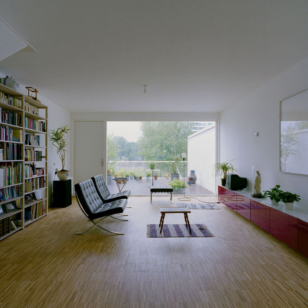 The house is accessed from the west side through a front garden with a depth of 6 meters. The garden is surrounded by hedges but has a more public character stimulating the personal contact among the inhabitants. The double high kitchen-cum-living room is directly related to the front garden but also accessed through the private parking garage. An open stair connects the space with the living room on the first floor that is flooded by light from two sides. The living room is protected from views from out the public space by a closed balustrade and is related to an intimate private terrace of 30m2 offering a nice view on the green courtyard.