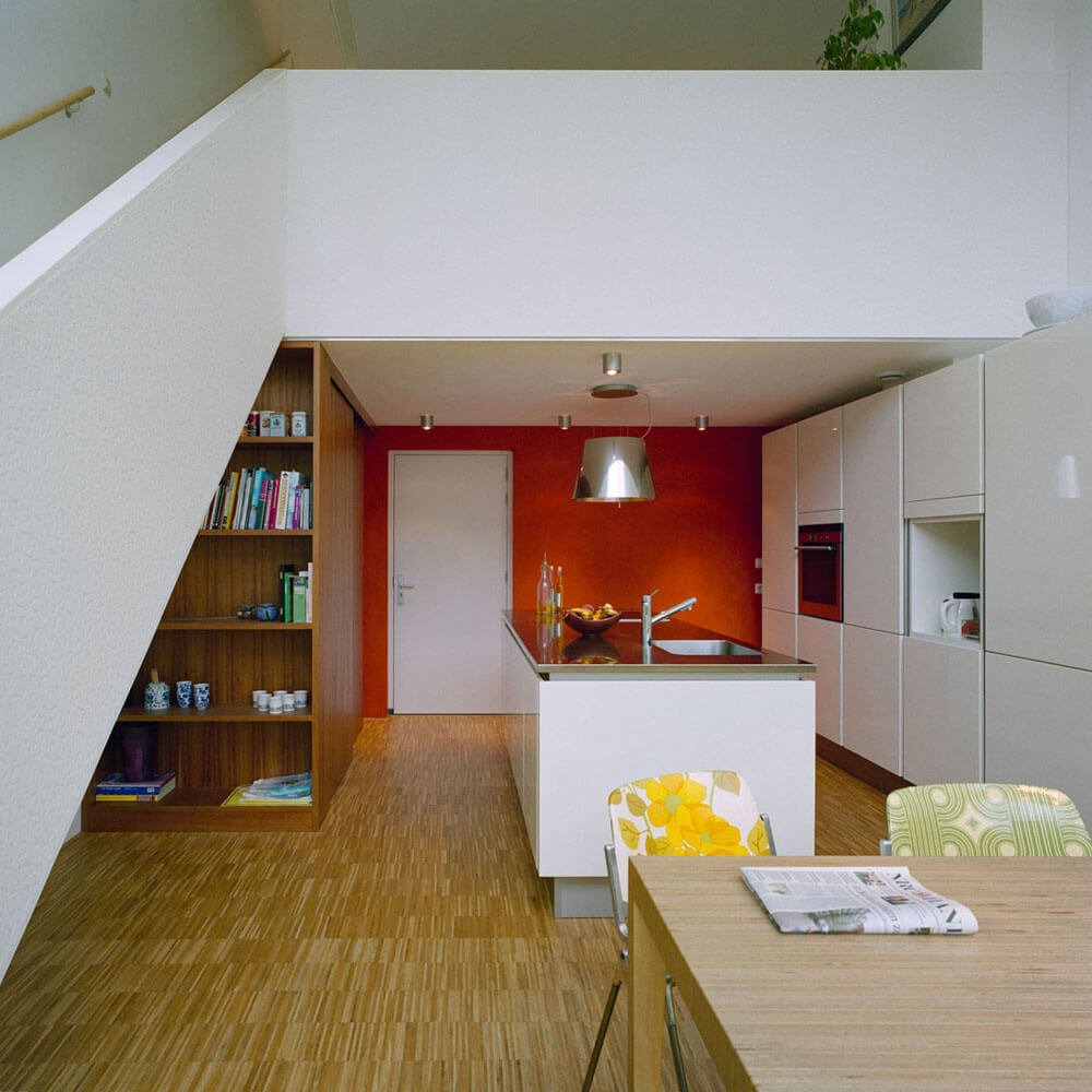 The second floor is used for sleeping and working rooms. Partitions are movable and allow a variety of spatial organisations. An optional roof space on the third floor is offered during the selling procedure to the future inhabitants.