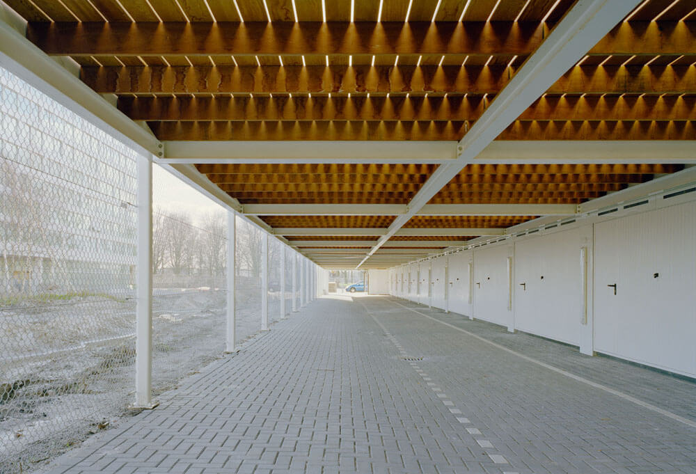 The necessary parking garage is not built under ground but at ground level to avoid waterproof concrete constructions and mechanical ventilation. The garage is realised as a cost-effective steel construction and put in front of the concrete construction of the town houses. The roof of the garage is used for private terraces.