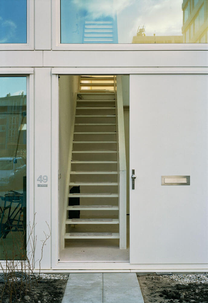 The interior design is very modest. Corridors are avoided to be able to save space. The stairs are directly positioned into the living room. Very economic standard stairs are used but covered by a special designed balustrade to integrate them into the total composition of the houses.