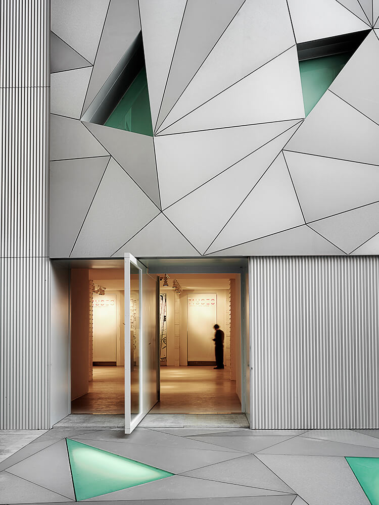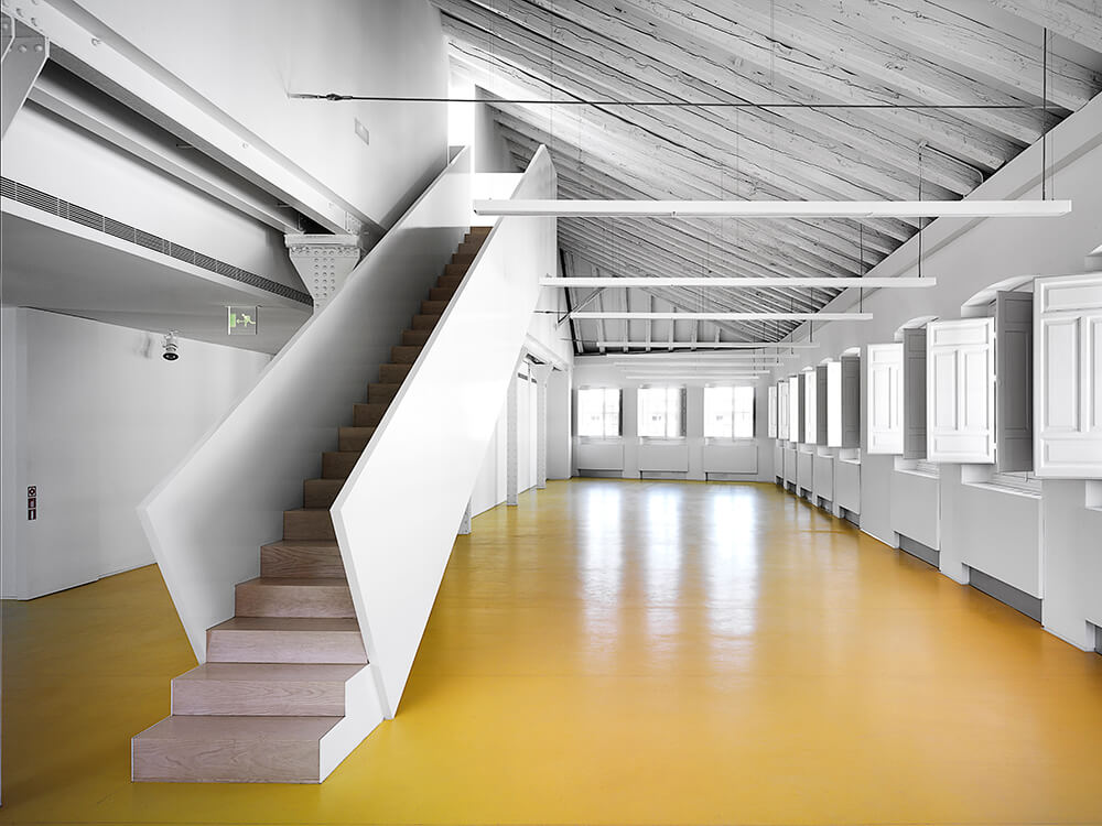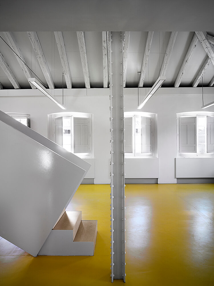 The architectural mechanism used to obtain the aim stated is based on the creation of a “tensioned vacuum”, a “spatial dihedron” formed by the horizontal plane of the floor of the patio and the vertical plane of the internal façade of the old factory.