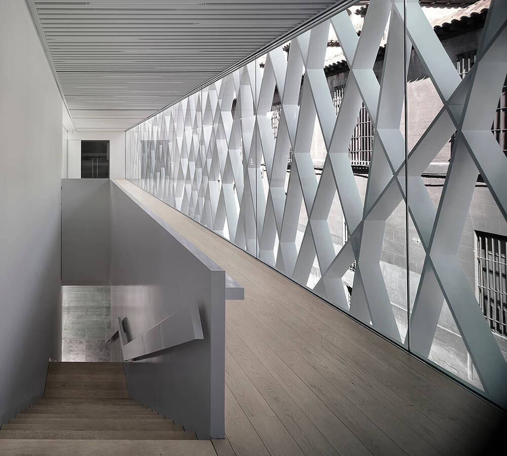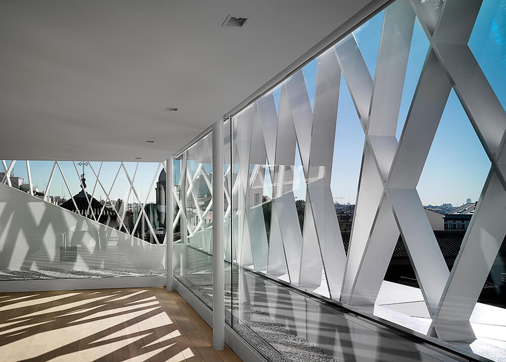 The last operation in the external part of the set, consists in creating a “bar of light” over the roof of the old factory. The construction of this intends to provide spaces to house the machinery of the installations, currently located there, to house a well-lit work and reading area over the city and to identify the ABC Foundation as a new “torch in the city” at the Conde Duque centre.