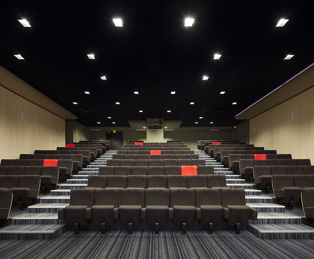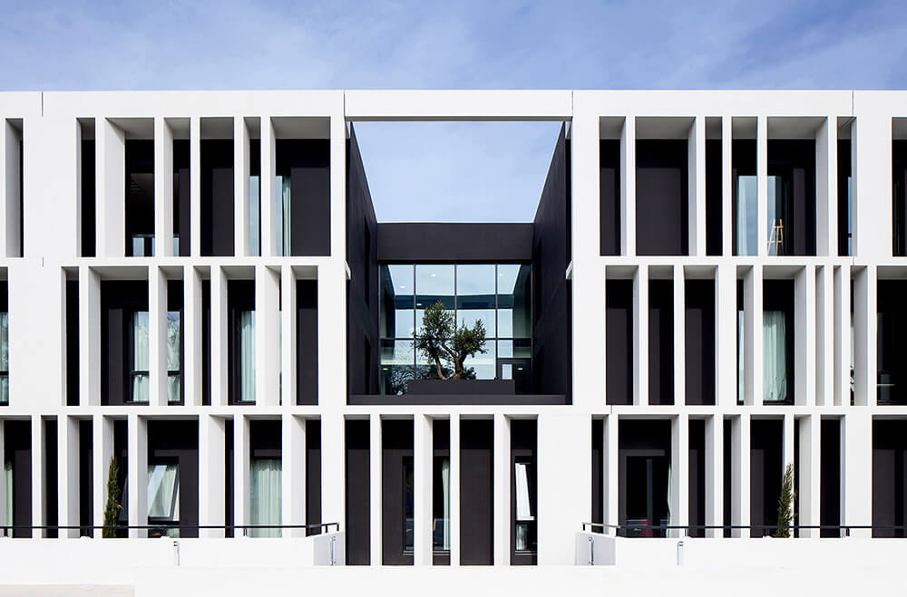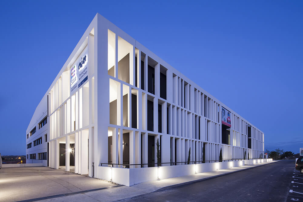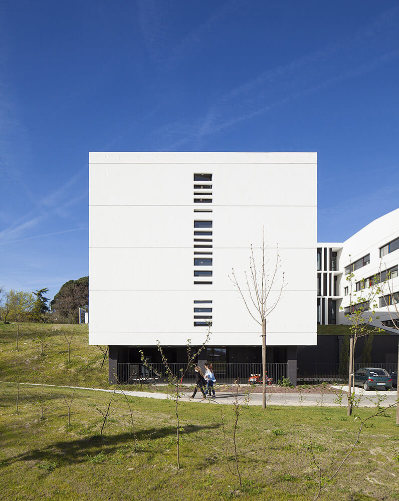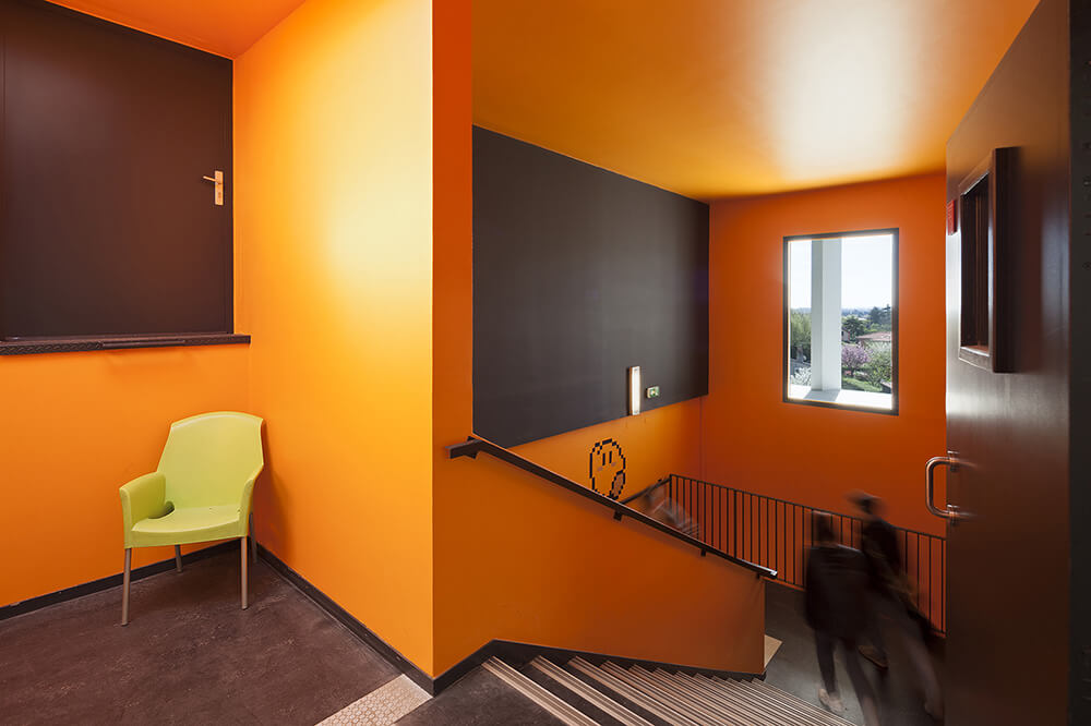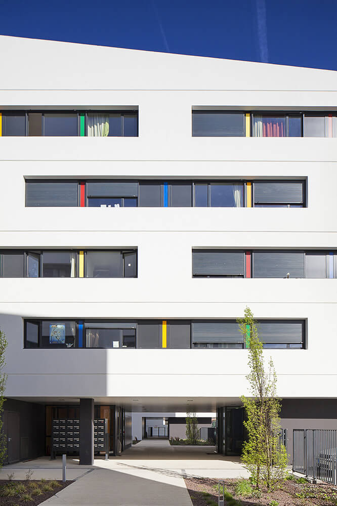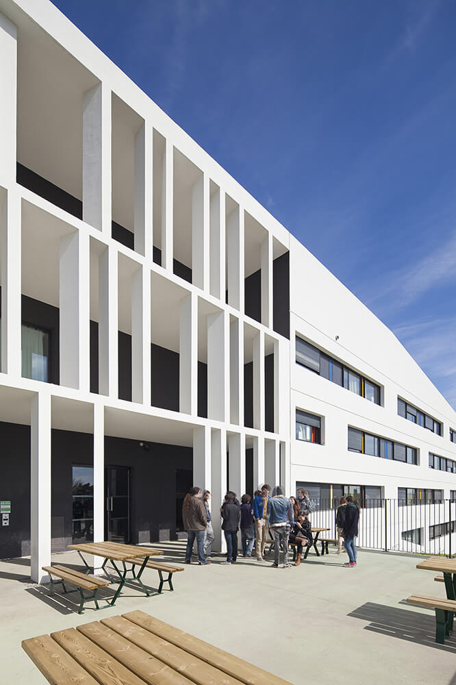 The school, overlaid with two levels of parking (55 spaces reserved for school and 60 for the residence), offers facades that affirm their identity on different orientations. The facade, randomly double laced in a vertical rhythm, gives a depth and lightness to the whole process while allowing the necessary sun protection to the various rooms. Facades create a graphic effect sustained by projected shadows and a colored highlighting.