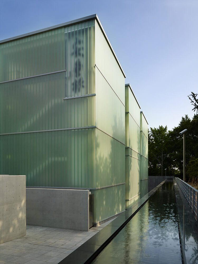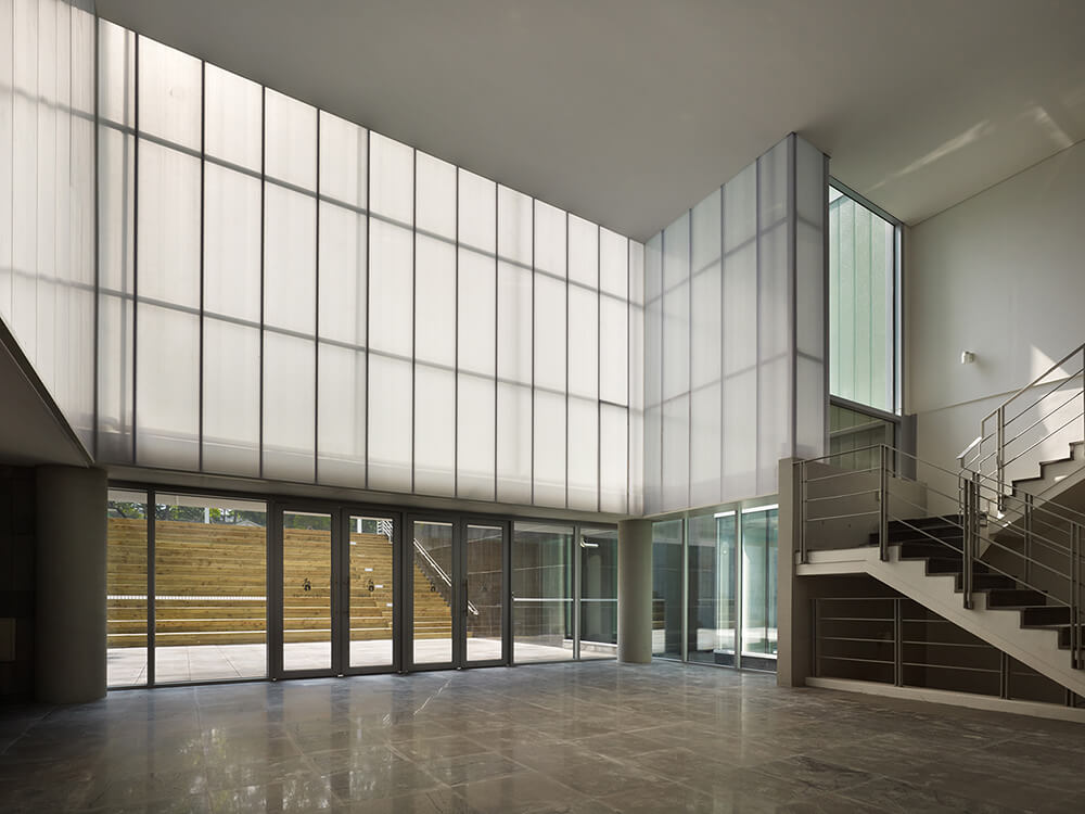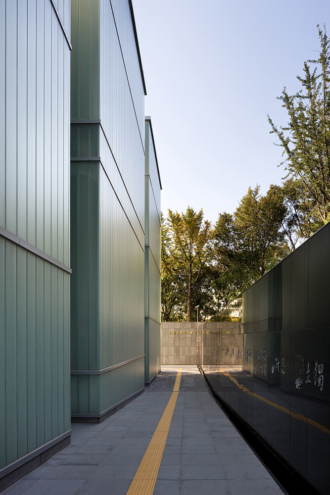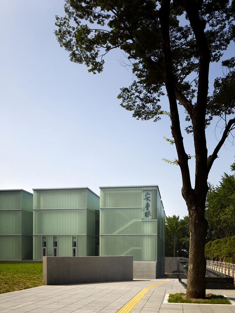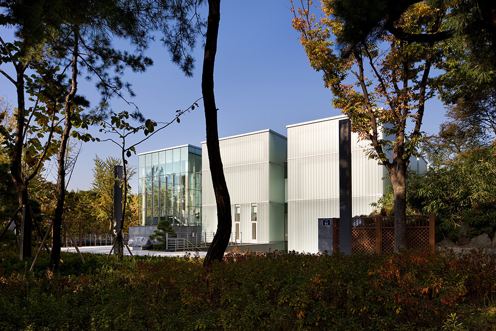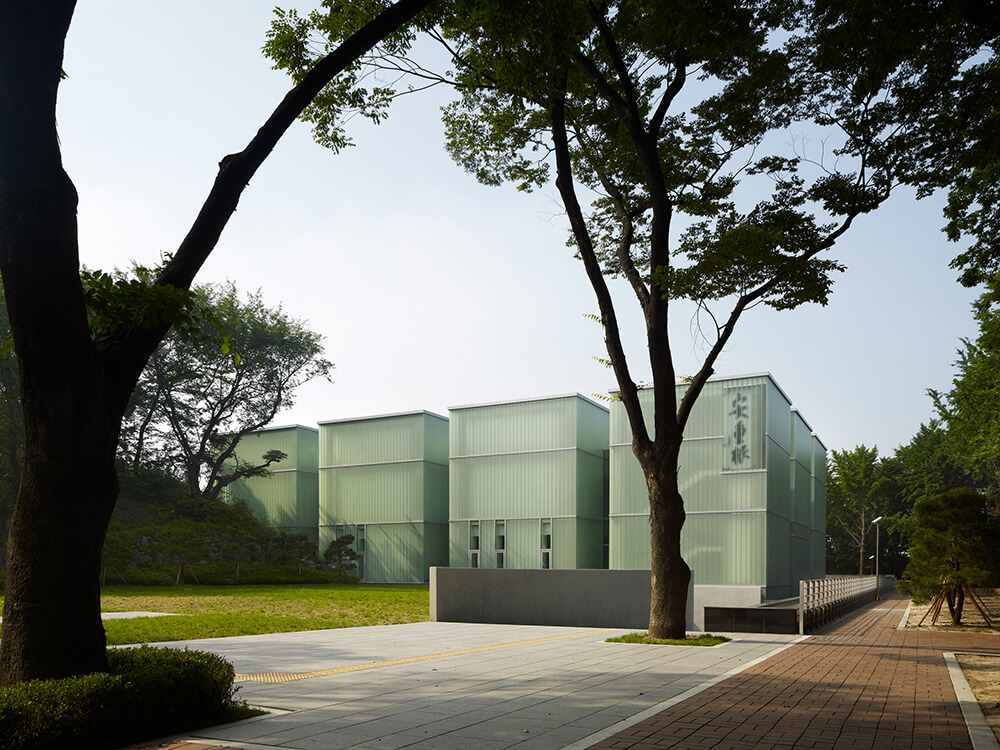 The Ahn Jung-geun Memorial Hall is surrounded by 40-foot tall trees in Mt. Nam which is located in the center of Seoul. It is perfectly cube-shaped to be as compact as possible and half of its volume is below the ground level, which avoids being taller than trees around. Even if the site is exposed in the hillside of the mountain, the building is energy-efficiently nestled in the ground. The skins of the building are double-layered. In the assembly hall, polycarbonate panels are installed with 600mm spacing from double U-shaped glass to keep inside temperature stable as well as to bring natural light in. Water in the perimeter of the site is falling down to the sunken floor in summer, which cools down the building around. A three-storied void space is placed in the center of the building with a retractable skylight, which allows day light in and the building to be naturally ventilated in and out.