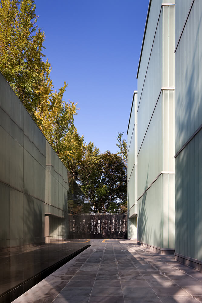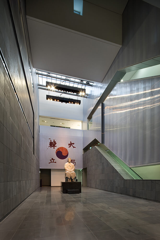 The new memorial hall is configured as a cluster of 12 columns that shoot up from the sunken base. The number 12 symbolizes the unsung heroes of Dongeui Danjihoe – a secret society whose name roughly translates into the Society of Patriots – that was originally organized by Ahn. The members severed their little fingers in 1909 in a demonstration of their loyalty and determination to the underground liberation movement. The 12 massive columns stand tall, like spirit tablets, towering over the old site of the war shrine.