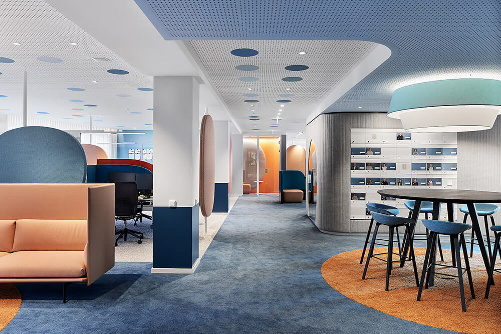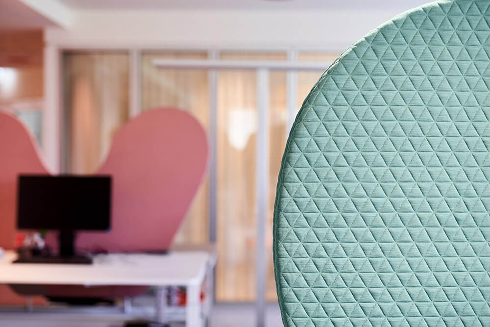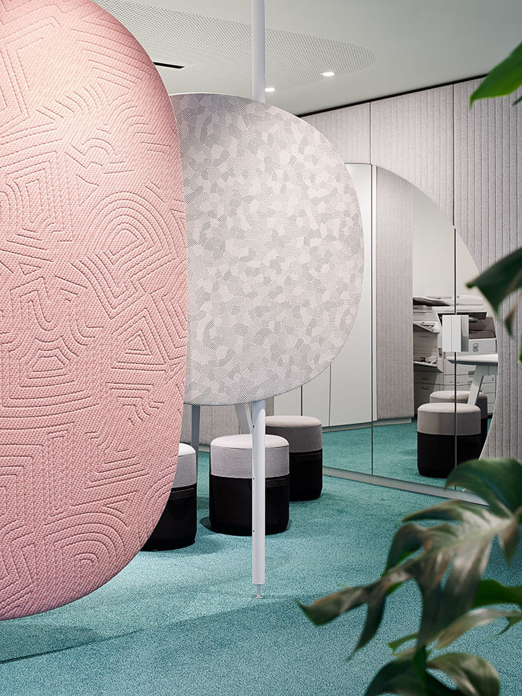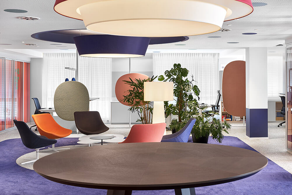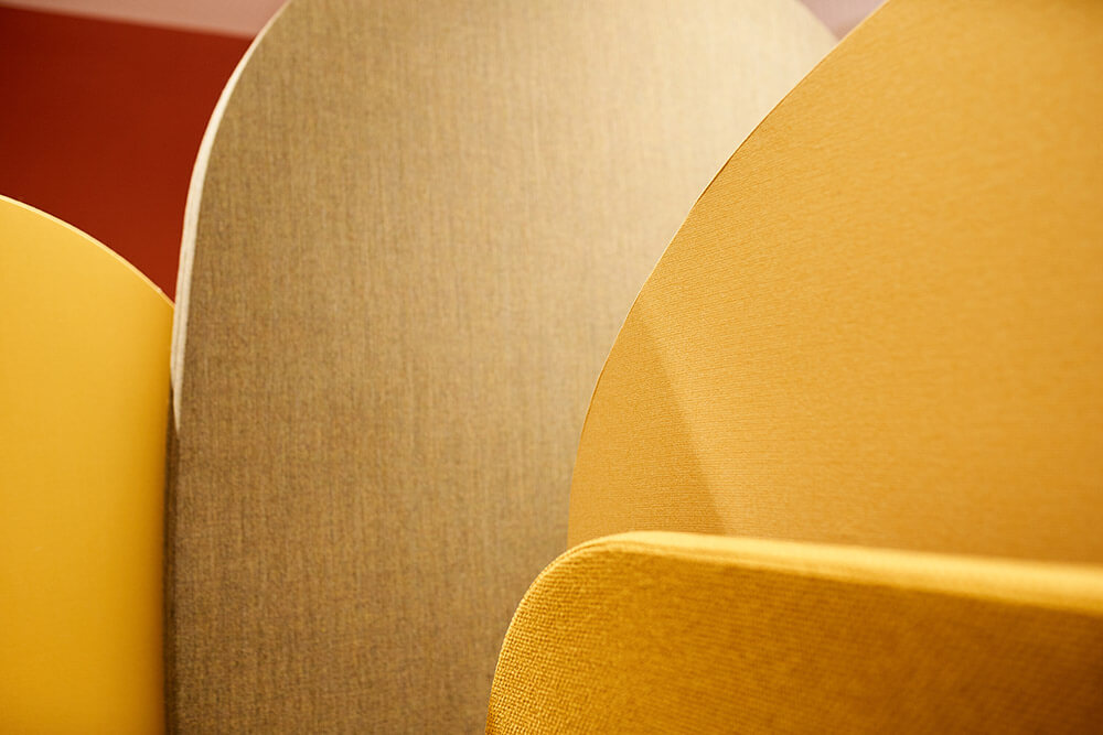 Inclusive design is about more than just barrier-free accessibility. A use-friendly environment ensures that all employees can rise to their full potential. Starting with cosy telephone booths with upholstered elements that serve as acoustic oases. Noise reduction using soft, tactile and inviting textiles is not limited to the retreat rooms, however. Carpets with striking colours and tactile surfaces also provide clear guidance, thereby ensuring an increased level of workplace safety. Finally, the coding of the different zones is intuitively understandable.