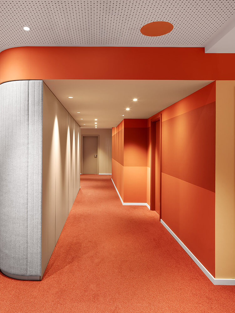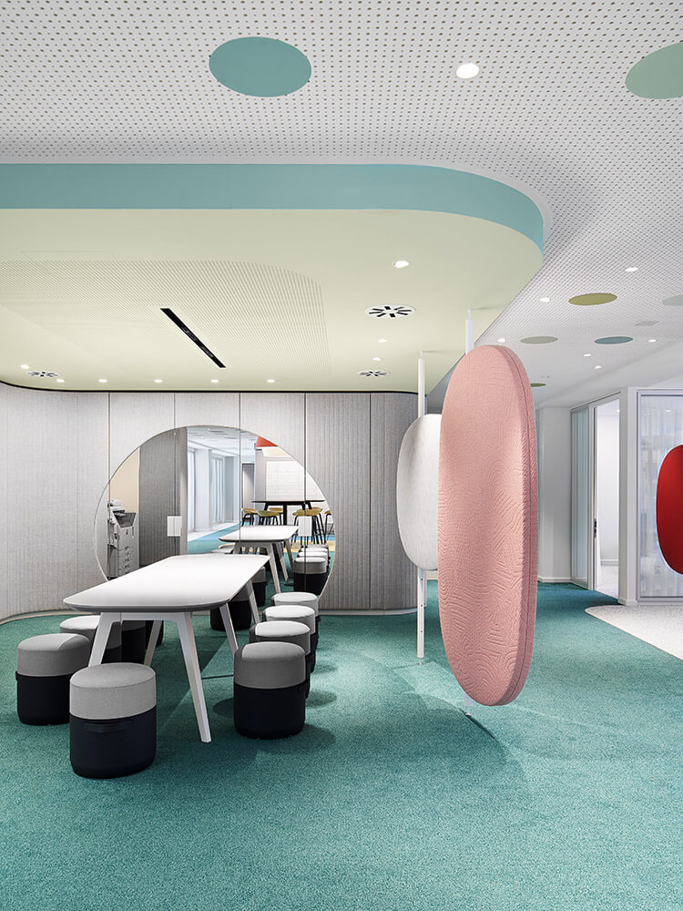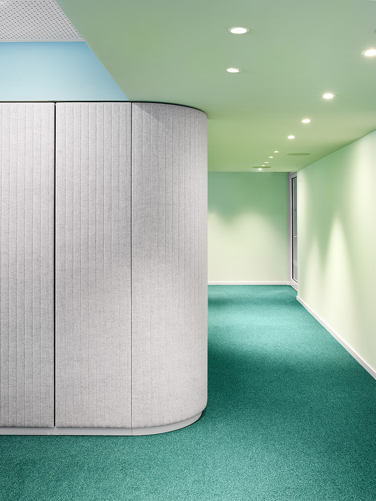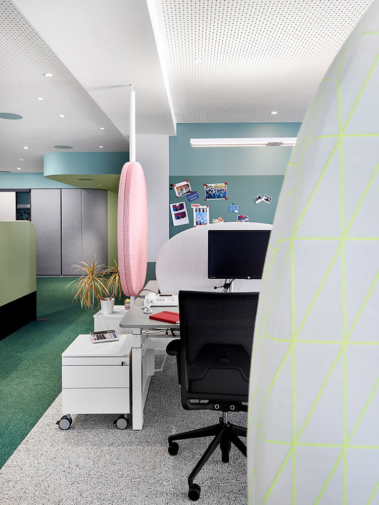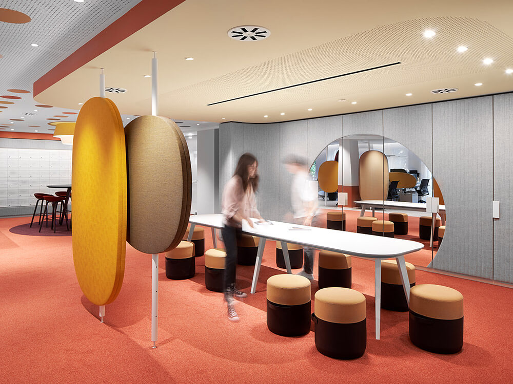 Employee diversity is illustrated in the bold colours of the room elements. Changeable furniture, soft materials and round shapes that are never perfectly round. Each of them is unique, just like the personalities who work here. A joy for life is expressed throughout. Differences are revealed, all of which appear quite normal here. A sense of well-being can be felt at all times. The space tells stories. And the work world is readable for everyone in their own language. Lust for life. Desire for diversity. Vibrancy. Diverse, variable, inward leaning, approachable, taking a stance. Equal rights on an equal footing. This is what distinguishes our work world for Aktion Mensch.
