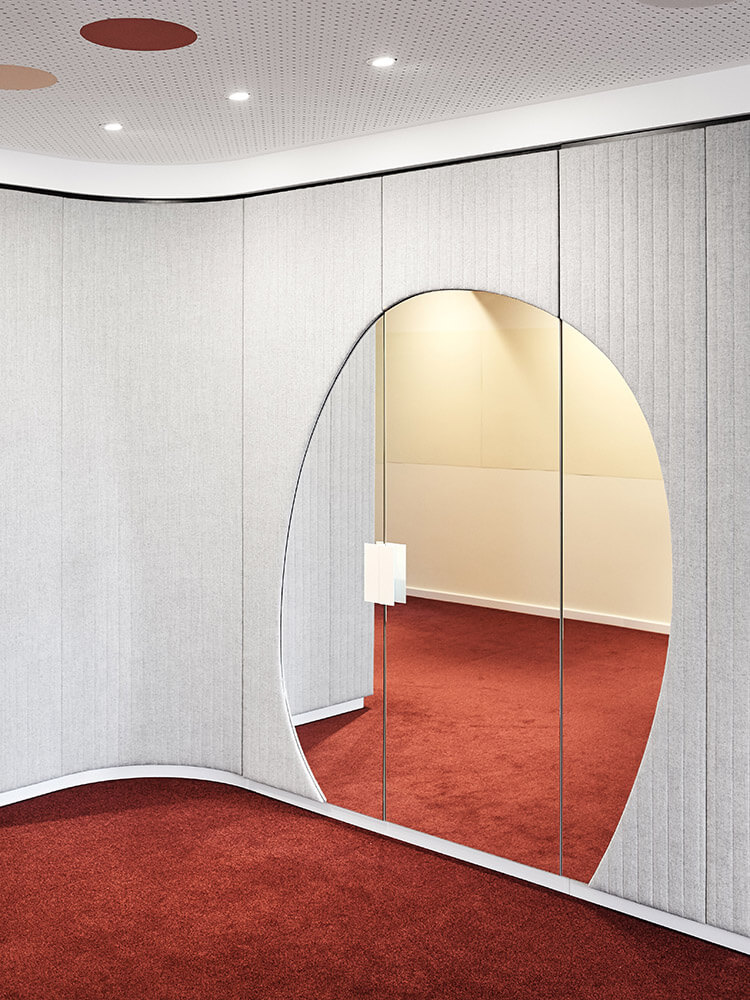 The modular spatial system works with revolving panels for flexible use and individual adaptability. It allows specific needs to be met at all times. This also applies to the acoustic panels, curtain filters and planted islands, which provide additional privacy. Mirrors are employed to enlarge the space. Modular furniture such as height-adjustable tables for wheelchair-accessible working and wheelchair-accessible kitchenettes are integrated as a matter of course. Privacy is created by means of freestanding sideboards that offer lockable storage space and encompass a particular area as guiding objects. Media technology is directly integrated into the upholstered walls. The lighting concept highlights the room panels and upholstered walls as homogeneous elements that structure the open-plan office and give it its unmistakable character.