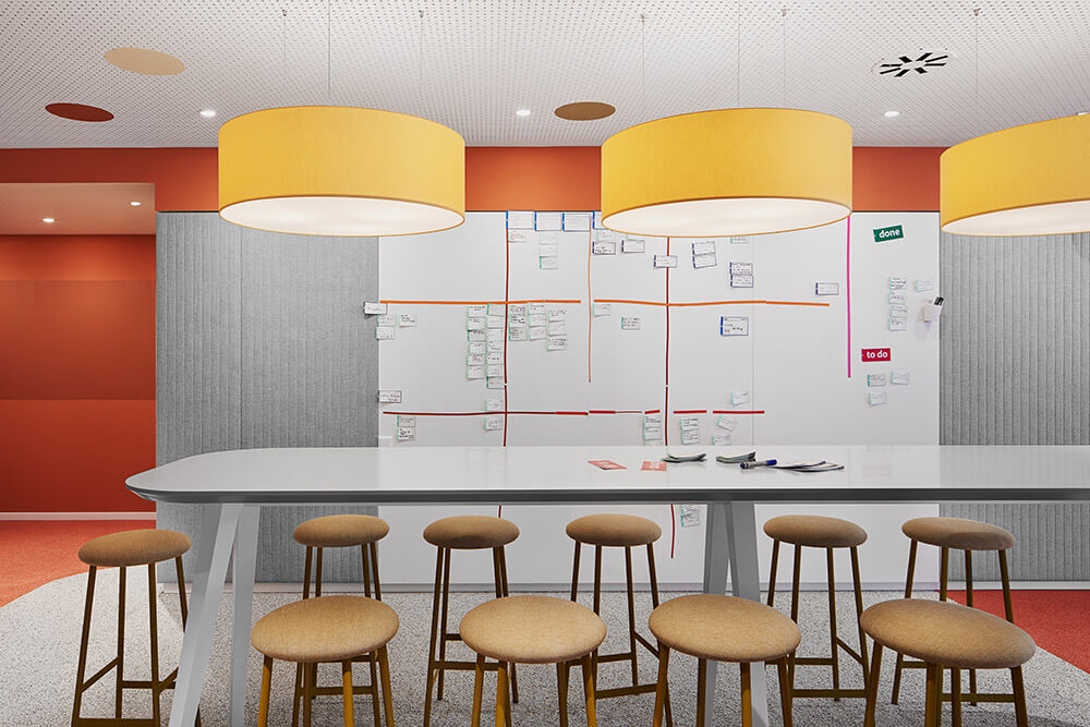 After reorganising the total floor area into eight zones, work life is organised around a village square that forms the centrepiece of each area. As central meeting places, all village squares have their own theme, from which the colour scheme for the square and the adjacent department is derived. Each colour concept is completed by an individualised ceiling. This always provides a definite answer to the question “Where shall we meet?”. At the festival, the harbour, on the sports field, in the garden, the library or at the market. This not only improves orientation, but strengthens the sense of belonging. Neighbourhoods are cultivated. At Aktion Mensch, cultural identity is created through real-life diversity. If nobody is excluded, then anonymity no longer has any place.