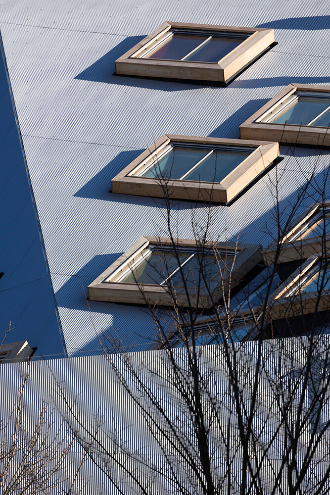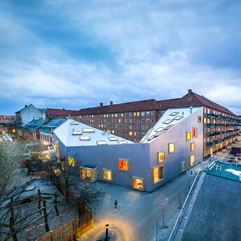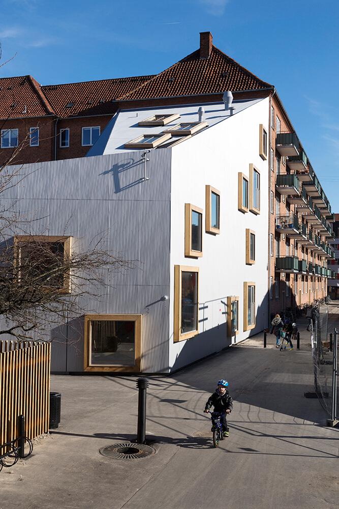 The Children’s Culture House offers various play facilities and programmes for children of all ages. Located on a street corner, the structure mediates between the adjoining brick buildings, which are of different height. In its form and use of materials, however, the centre is quite distinct. A silvery aluminium skin, perforated by square windows is drawn over the roof and outer walls and the lower height at the corner allows sunlight to enter the rear courtyard. The expression of the Children’s Culture House is surprising and imaginative: the roof and facades are treated the same, and the House does not have a “start” and “end” as ordinary houses do.