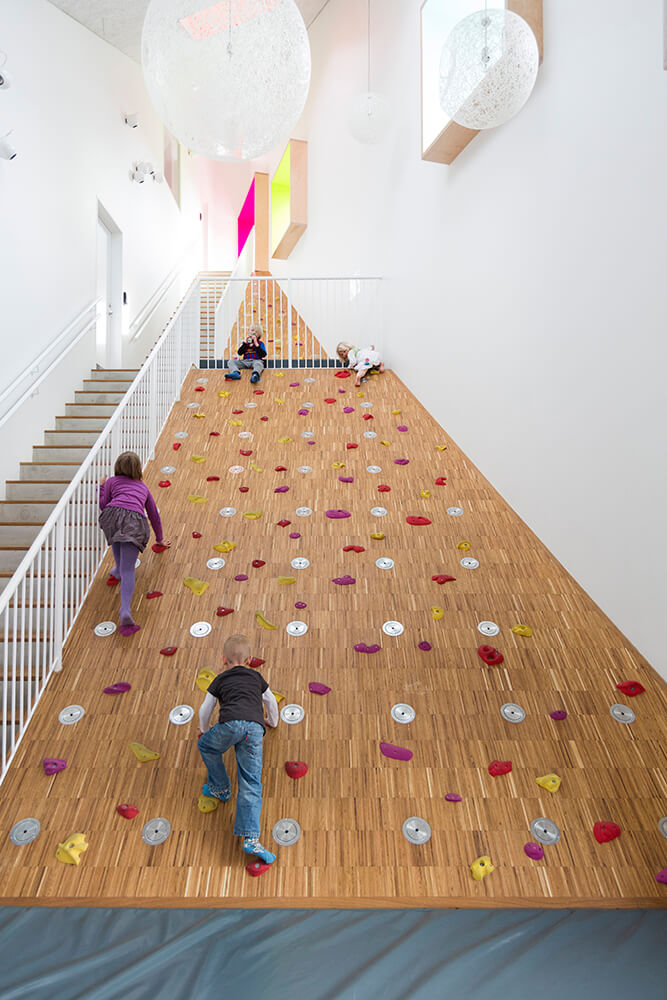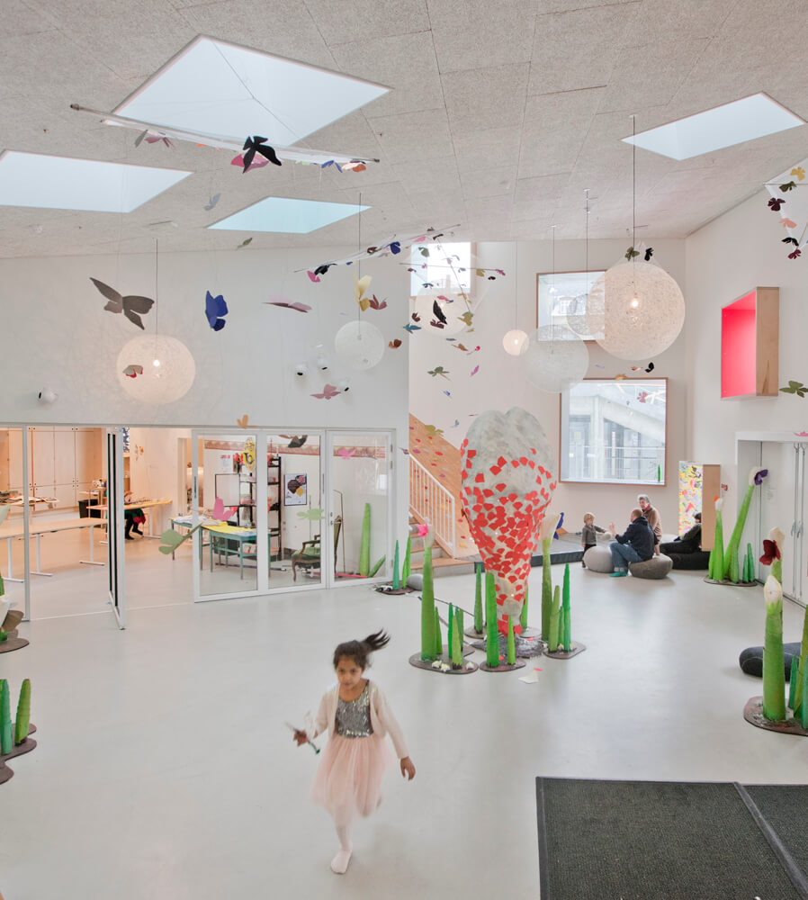 The collaboration between Dorte Mandrup Arkitekter and Kerstin Bergendal was very fruitful. Dorte Mandrup Arkitekter implemented the nine principles in the design concept and translated them into architectural elements. For instance the “beach” principle influenced the open flow of spaces. And also the opposite principle of being alone, a withdrawing with a single friend was implemented in form of recess-like play places of various moods and character.