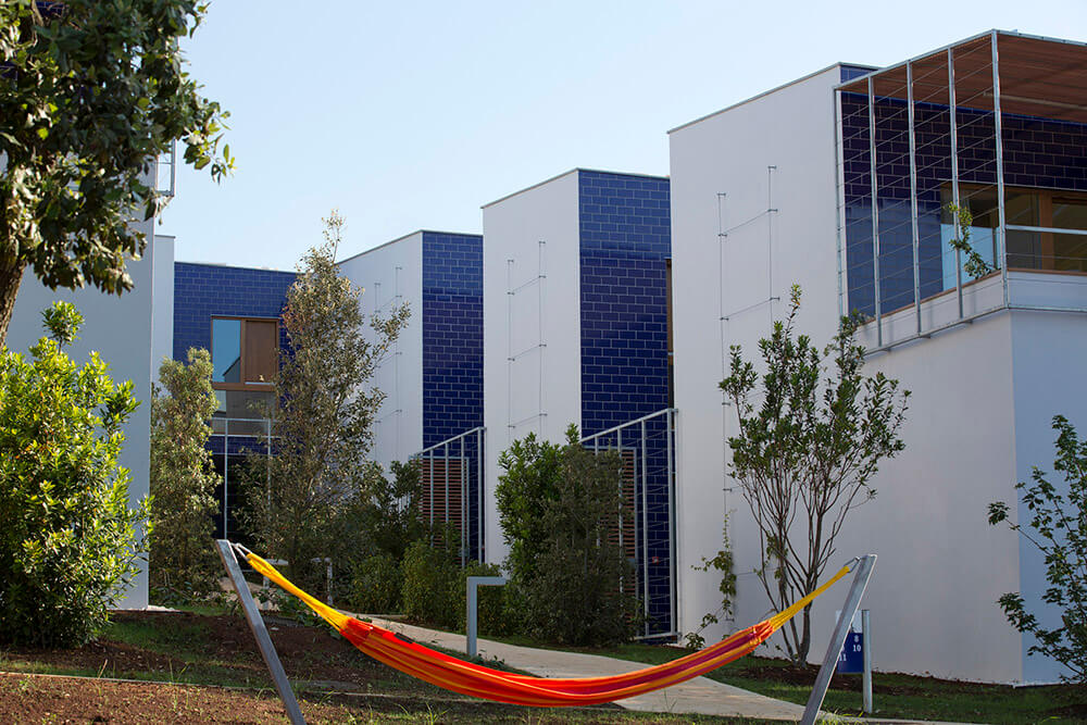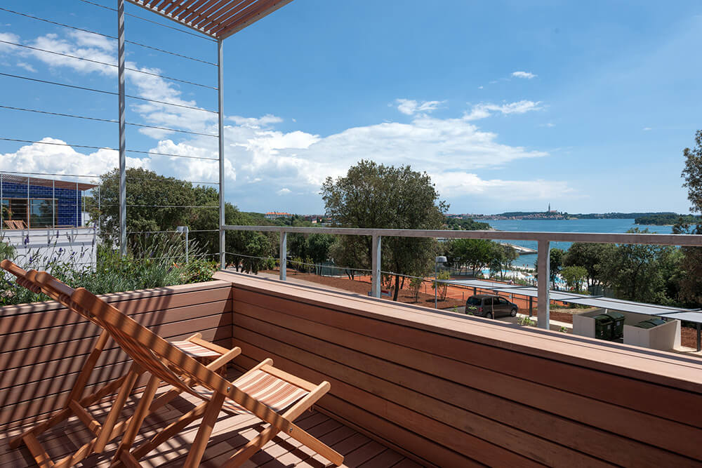 Amarin is entirely pedestrian, no cars are allowed on the site, and car parking is provided on the edge of the site. The main walking paths through the Apartment Village are between blocks, from where trails lead to the entrance of each apartment. All trails and paths are formed freely in relation to the natural slope of the terrain at the site. The rooftops follow the slope and have a final layer of coarse crushed stone; facades are finished in white plaster and ceramics in the colors of individual blocks. Outdoor terraces are made from wood, with wooden pergolas and privacy is insured by a green wall of plants that grows supported by the terrace construction.