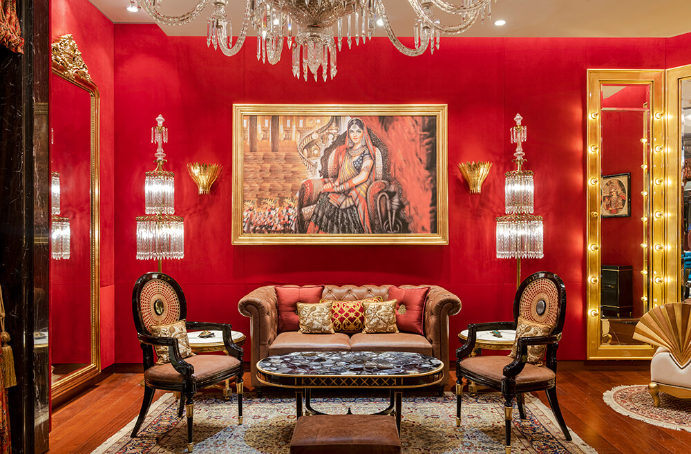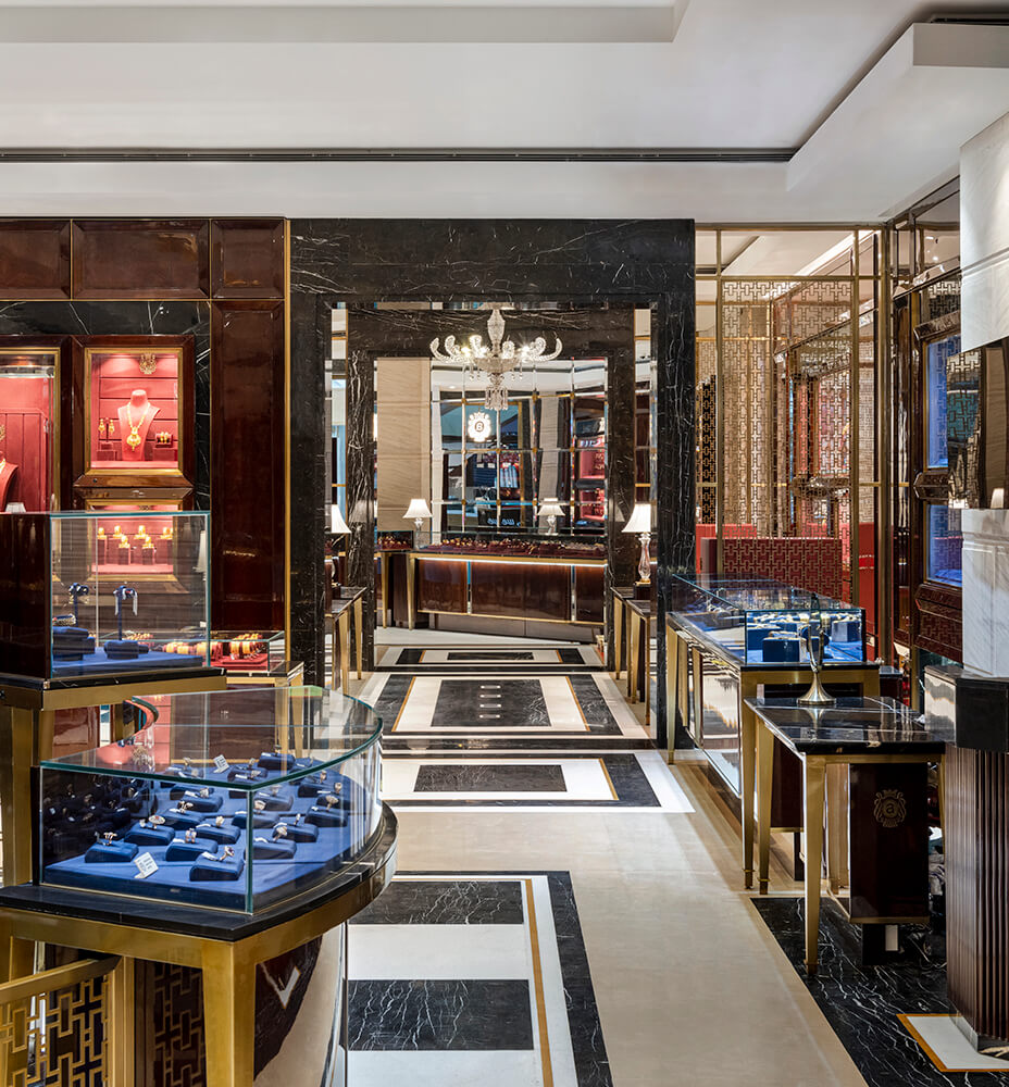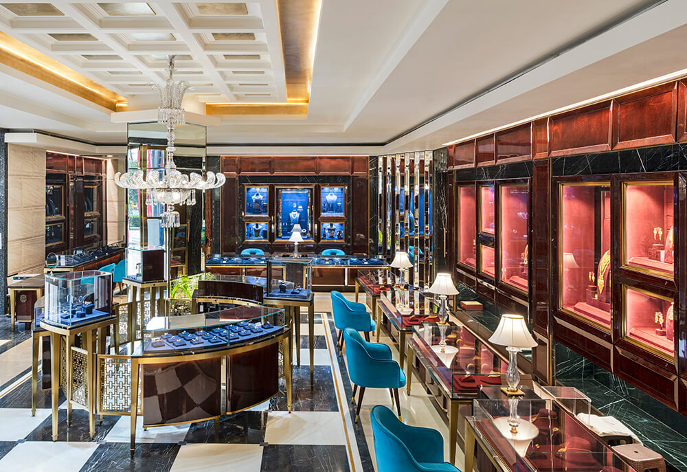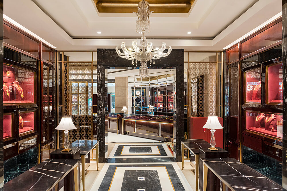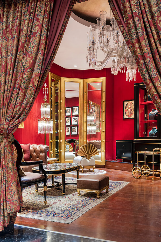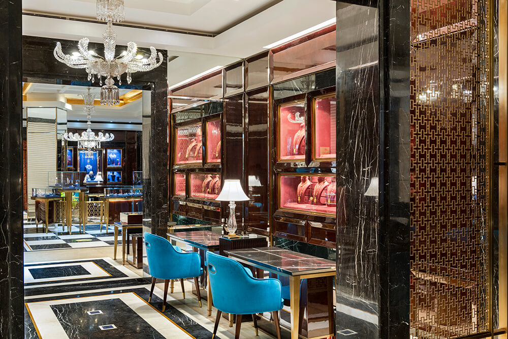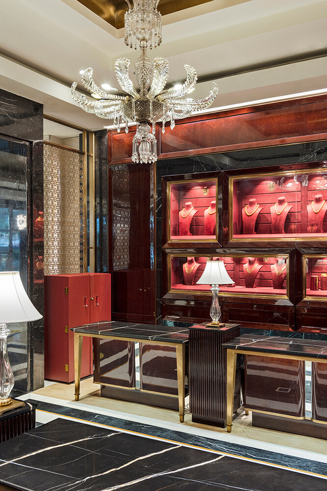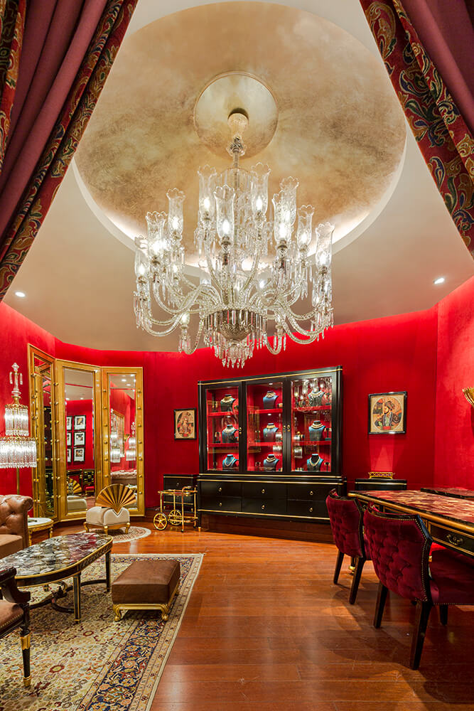 This section in the store witnesses the juxtaposition of colour and elements of gold in an unabashed and bold persona against the pristine overarching neutral tones. Opulence becomes the protagonist as the deep vermillion-hued walls embrace the space, and the lustrous detailing in gold makes its debut in tasteful doses. The inspiration stems from the fanfare of sumptuous Indian weddings, wherein bright hues, traditional nuances, and heirloom jewellery become intrinsic parts of the celebrations.