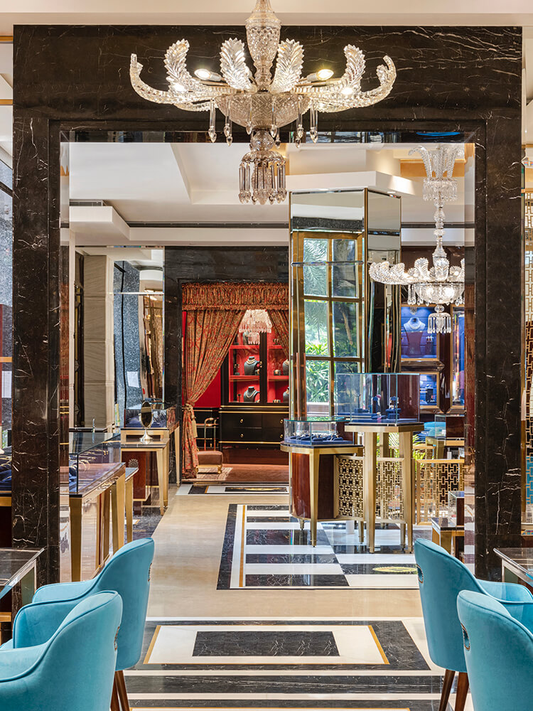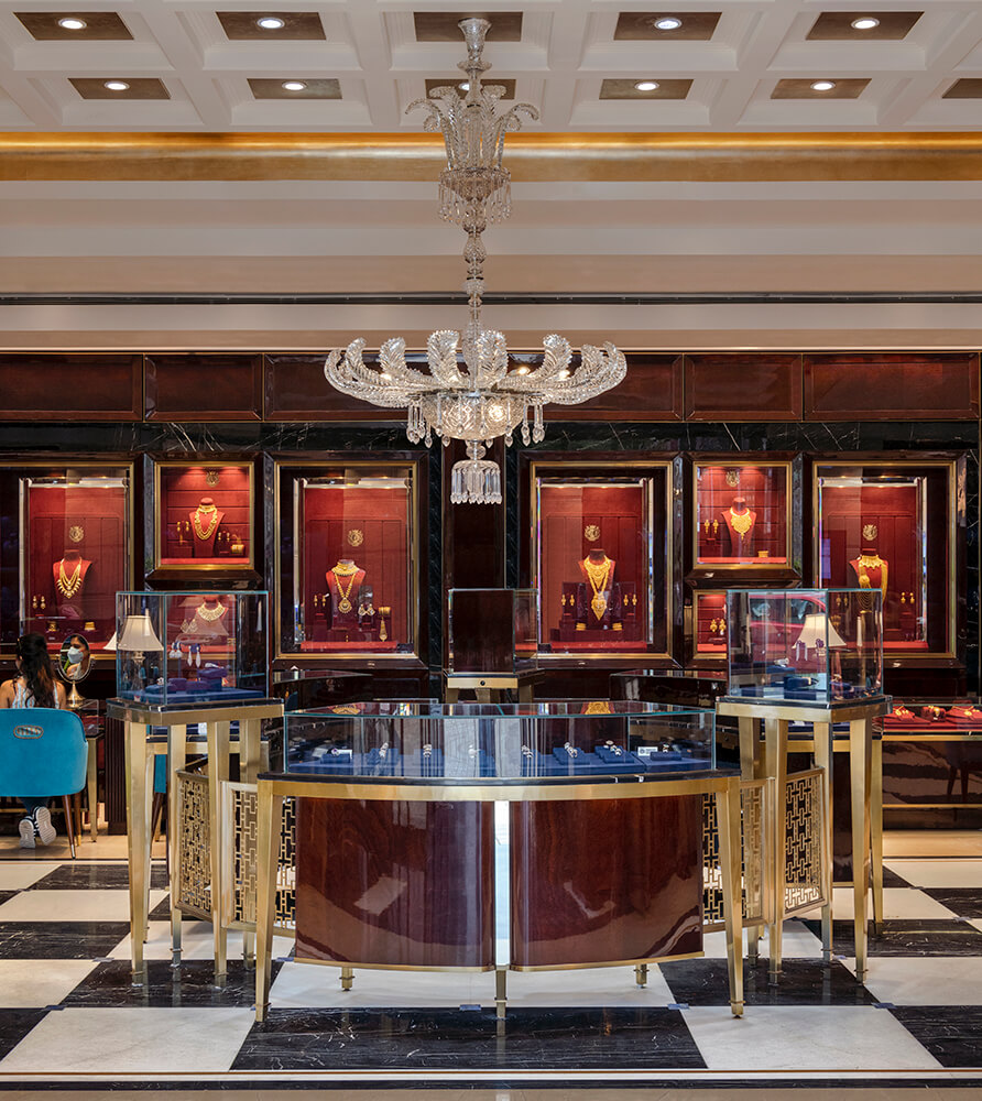 The central secular jewellery display counter introduces elements of gilded jaali work, creating an objet d’art that anchors the space and a detail that gets carried through in various segments of the store as a leitmotif. The positioning of mirrors in the store has been devised to amplify the reflections abundantly; bevelled vertical mirrors grace the space, creating a sense of expanse and grandeur. The monochrome flooring pattern is dapper and minimalistic; the checkered pattern in the heart of the layout layers the spaces with a visually distinctive character. Staying true to the clean lines that dot the space, the coffered ceiling takes its cue from the crisp geometry displayed across the flooring of the store.