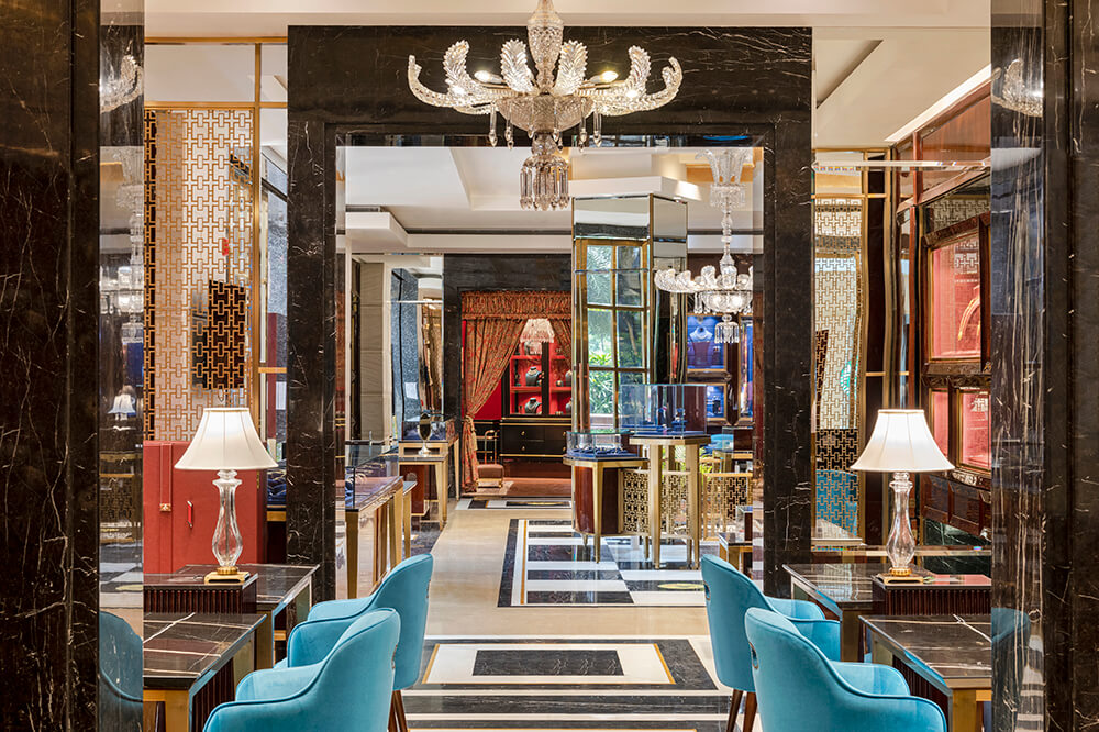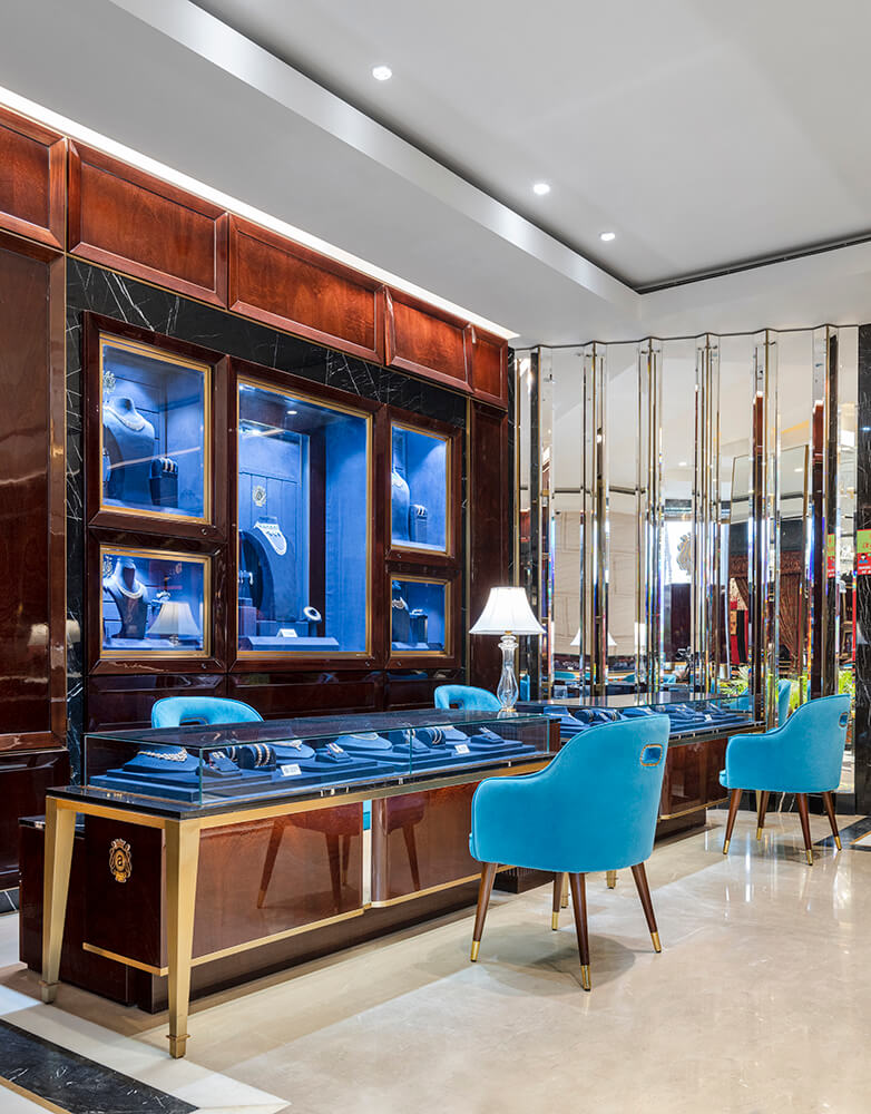 With a clear directive in terms of its pragmatic function and visual aesthetics, the design approach essentially becomes a sum of deliberate and impactful interventions that weave together the palette of the venue. The bespoke wall modules and vitrines have been rendered in a dark wood finish with undertones of burgundy and deep blue hues that punctuate them suavely. A curated medley of tables, warm teal-hued armchairs, ornate table lamps and display modules have been pieced together with a penchant for detail, creating a milieu that is functionally responsive and immersed in quiet luxury.