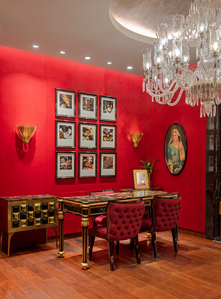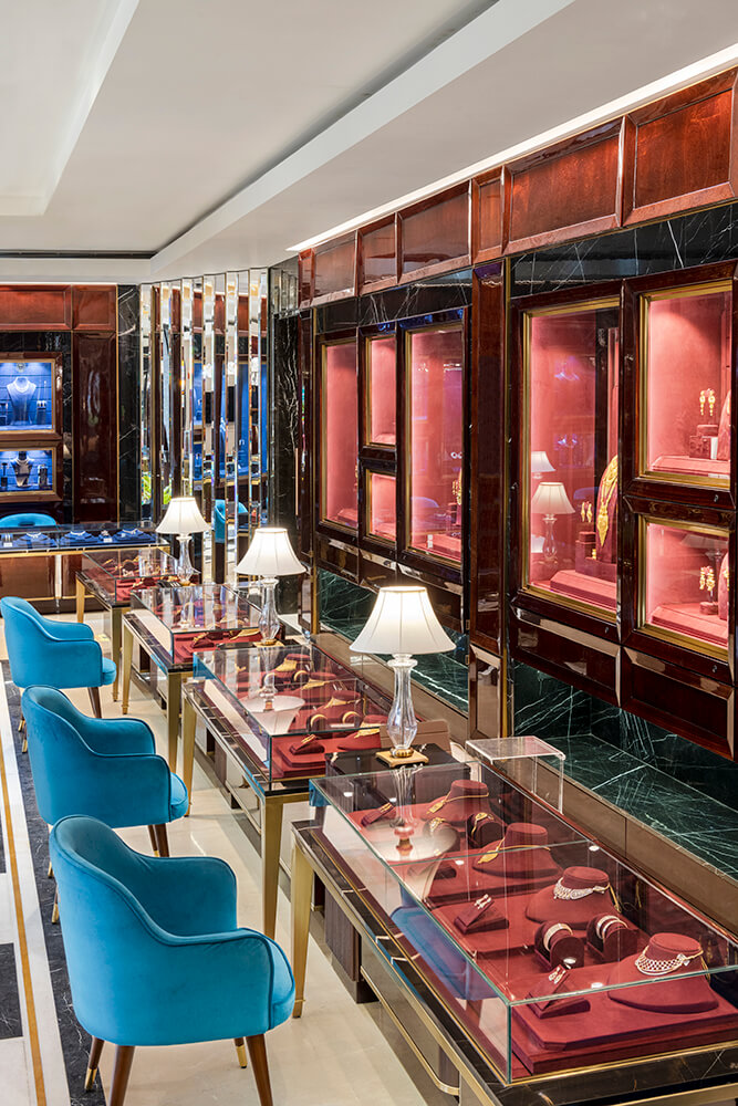 It allows a patron to enter and curiously discover the spaces as they unfurl successively, revealing the spectrum of diverse pieces that are segregated genre-wise under categories of Gold, Diamonds, Kundan, Polki, etc. The VIP zone of the blueprint assumes centre stage within the narrative. Doused in a scarlet hue that bathes the walls, this segment hosts clients in an intimate setting with a focus on the larger-scale selection process that dovetails most Indian wedding festivities and ceremonies.