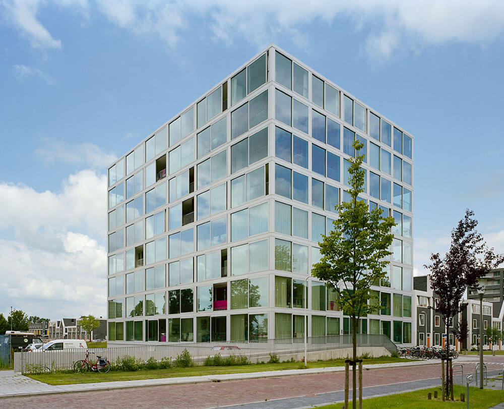 The building block, measuring 23m x 32m and providing 8 units per floor, has a very limited facade surface in relation to its floor area; this favourably affects building costs and enables the high quality detailing of the facade. The housing units are organized around a central core containing a double stair and an elevator. The plan layout allocates the larger apartments to the spatially interesting corners, thus creating apartments with double orientation.