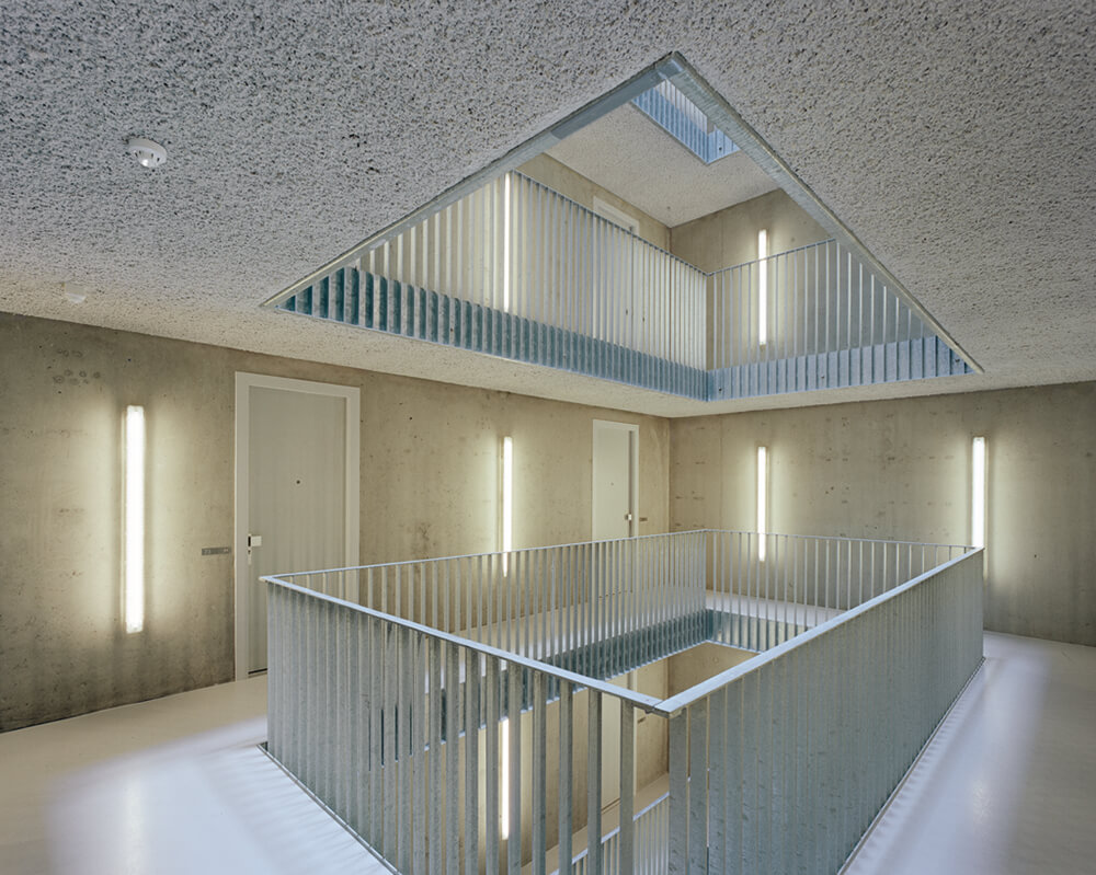 Due to the limited budget the central atrium was coherently designed in the rugged aesthetics of the unfinished. The concrete walls remain unfinished, the floor slabs receive a coating of acoustic plaster, handrails are merely galvanized and simple industrial light fittings are mounted directly onto the walls. As a result, a complex spatial entity emerges, deliberately displaying, but also celebrating, the ‘new poverty’ of contemporary building.