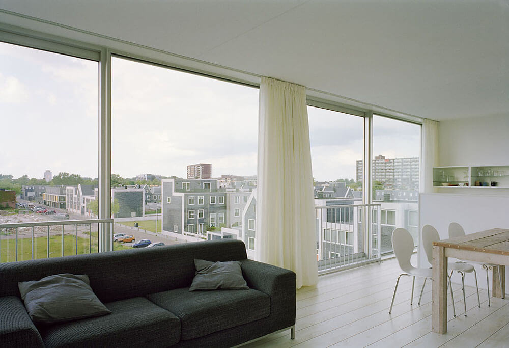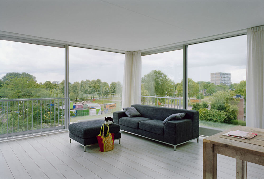 The floor-to-ceiling windows give the apartments a feel of suspended landscape plateaus; the natural environment becomes a part of the space and expands the interior beyond its physical boundaries. Rain, sun, clouds, wind and greenery determine the atmosphere of the interior.