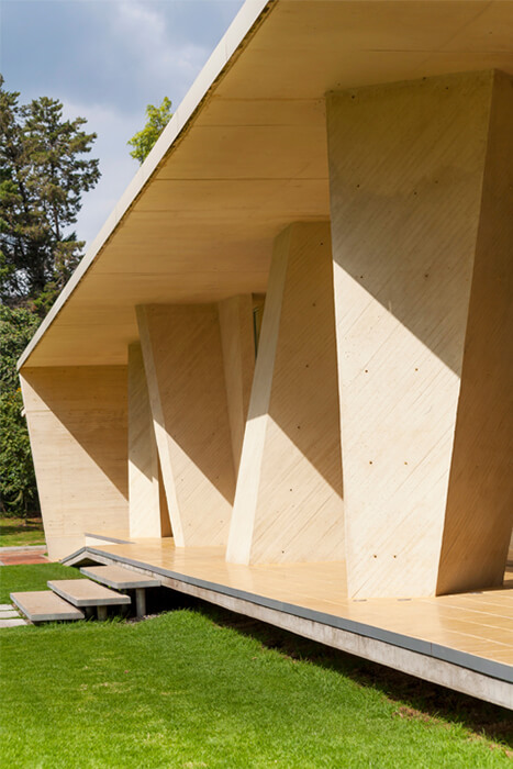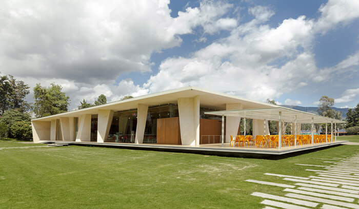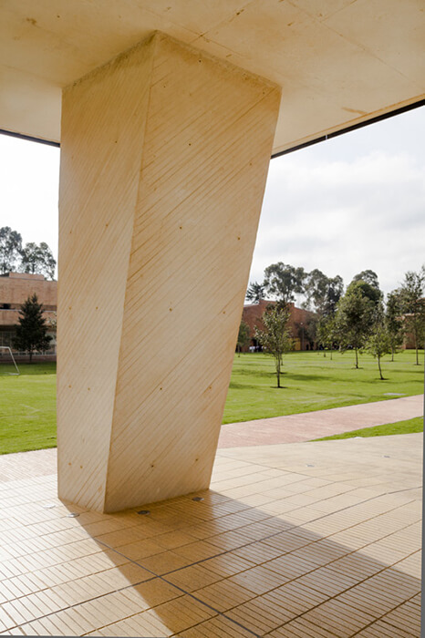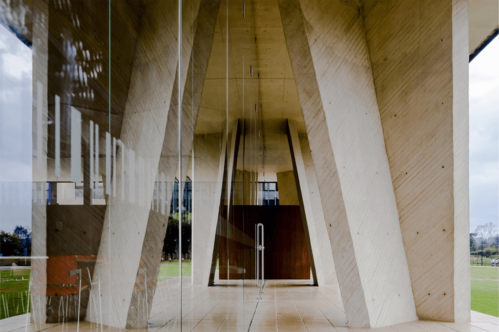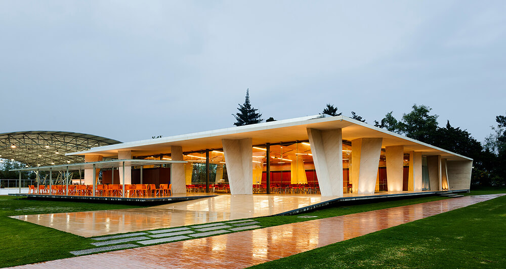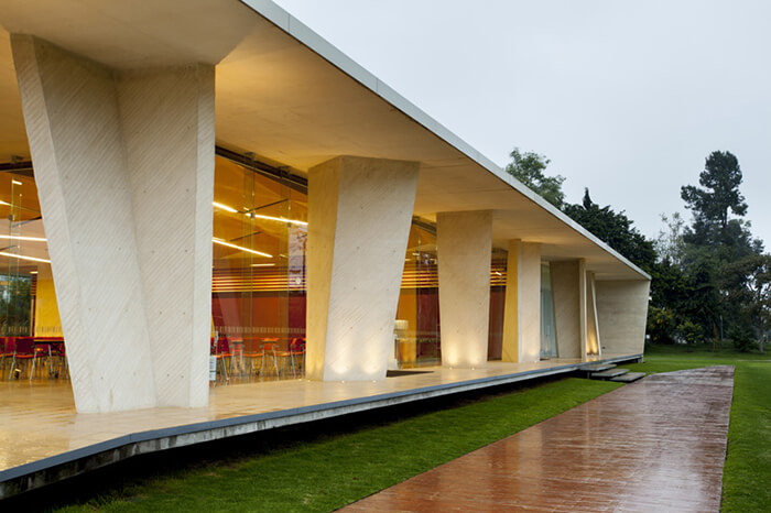 Aiming an expressive and seismically efficient structure, the pavilion was designed with a single type “V” column which gradually rotates and reverses, generating an apparently random sequence. The whole set of columns is contained between two analogous plans dilated from the ground, simulating that the building floats over the grass.