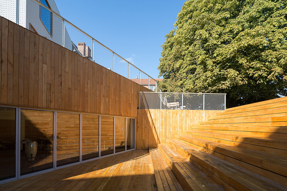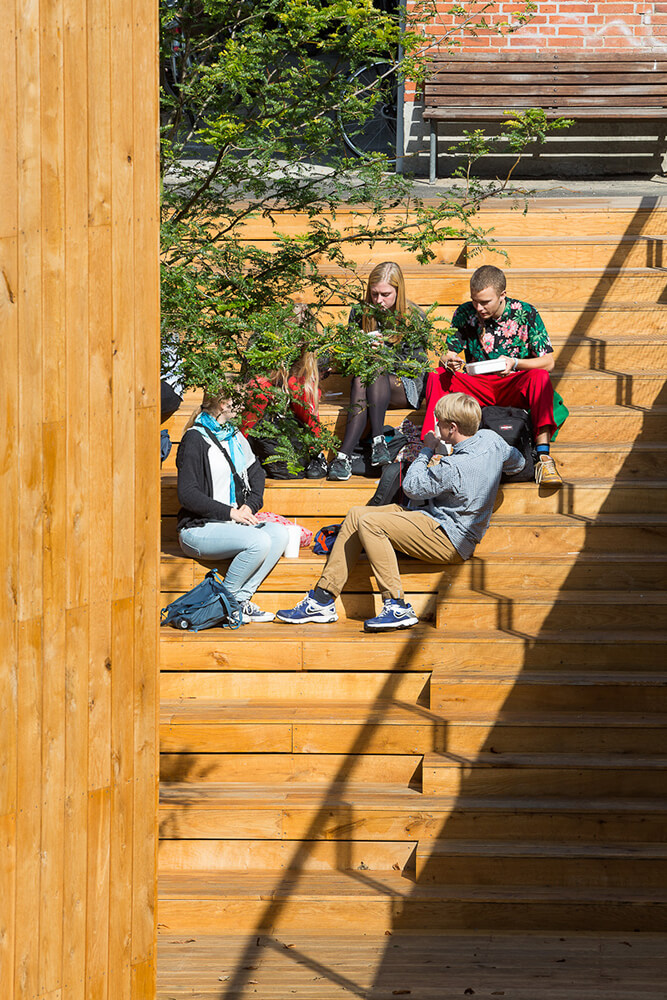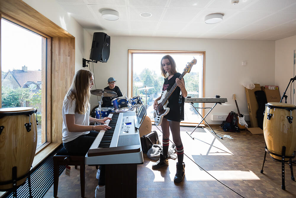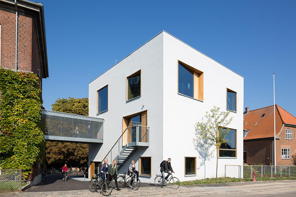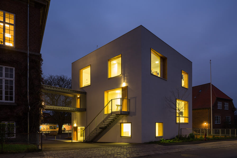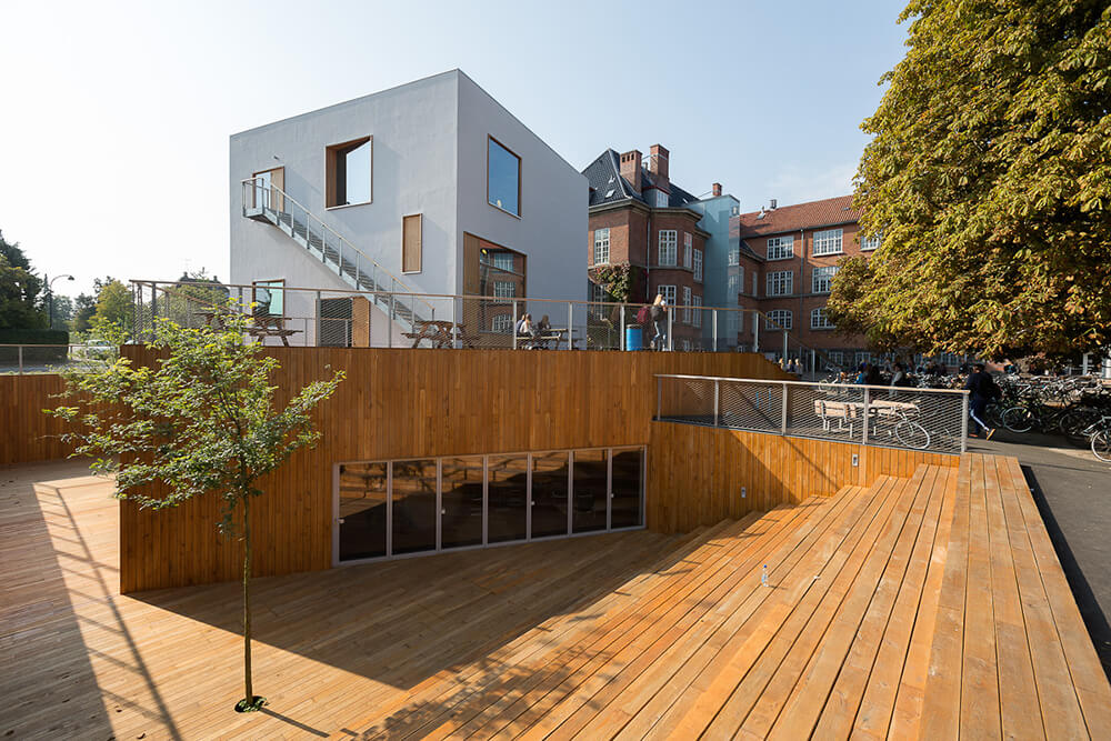 The project is an extension of modern music facilities to Aurehøj Gymnasium. The street along the high school’s main building is characterized by the longitude of the main building and by an opening to the court yard. The new building is placed at the end gable of the existing building, connected by a bridge and twisted from the street to underline the movement along the main building and into the school yard. To ensure a well-proportioned and down scaled new building in relation to the existing Gymnasium, the program of the extension is split into two volumes, one of which is under ground. The extension has three main architectural elements: The compact cube containing teaching facilities and studios, the dug down rectangular court yard that offers a wind-protected area towards south and the elevated terrace covering 120m² rehearsal space.