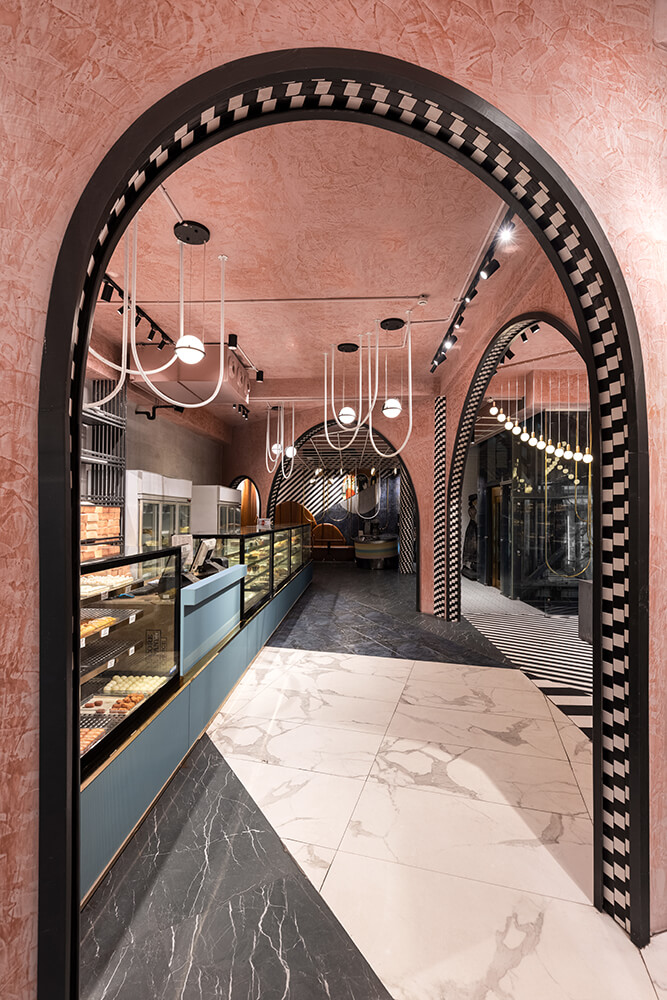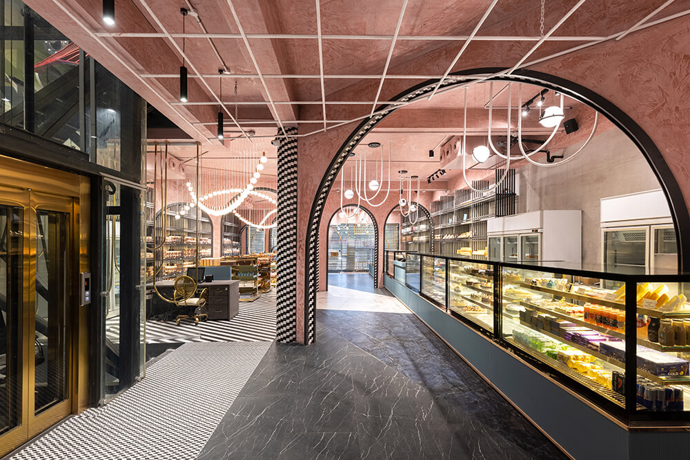 Capturing the quintessential spirit of the 1920s, the pastel stucco marble textured ceiling is juxtaposed with monochromatic tiles. While the display racks along the light grey washed walls are kept muted, the free-standing shelves are finished in “aureate” edges for the classic “Midas touch”. To facilitate the recall value of the visit, spherical and bulbous luminaries are suspended in a dramatic fashion, synchronizing with the avant-garde spatial vocabulary dictated by the arches and their monochromatic character.