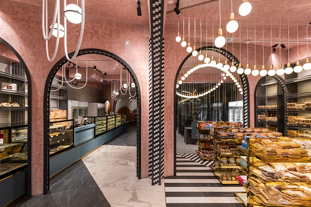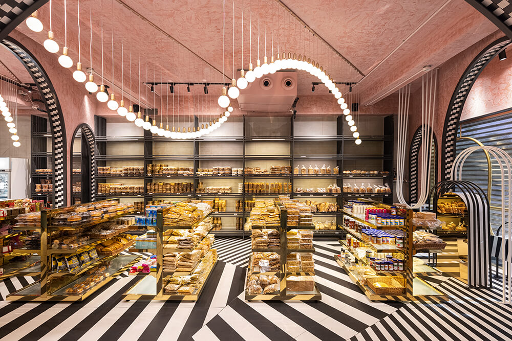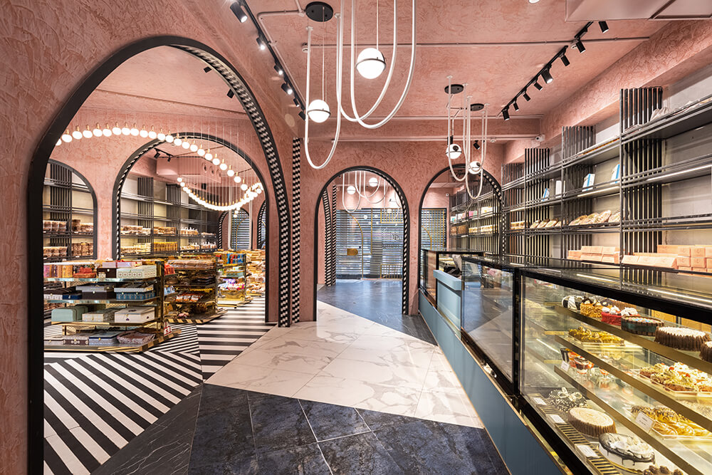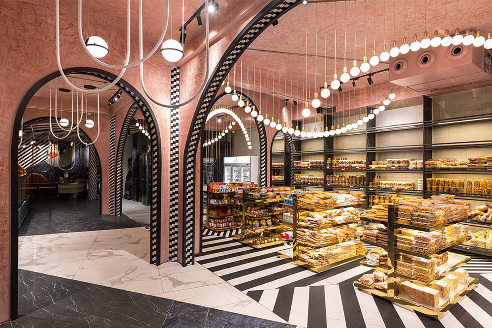 An effort was made to recreate the bygone British colonial era vibe. A distinct visual tone was set with art deco reminiscent arches in chequered soffits, a kaleidoscope of monochromatic flooring and pastel blush ceilings. Suspended bulb light fixtures orchestrated a vintage symphony in the form of inverted arches while metallic gold accents seal the retro vibe of the store bringing in just the right amount of bling.