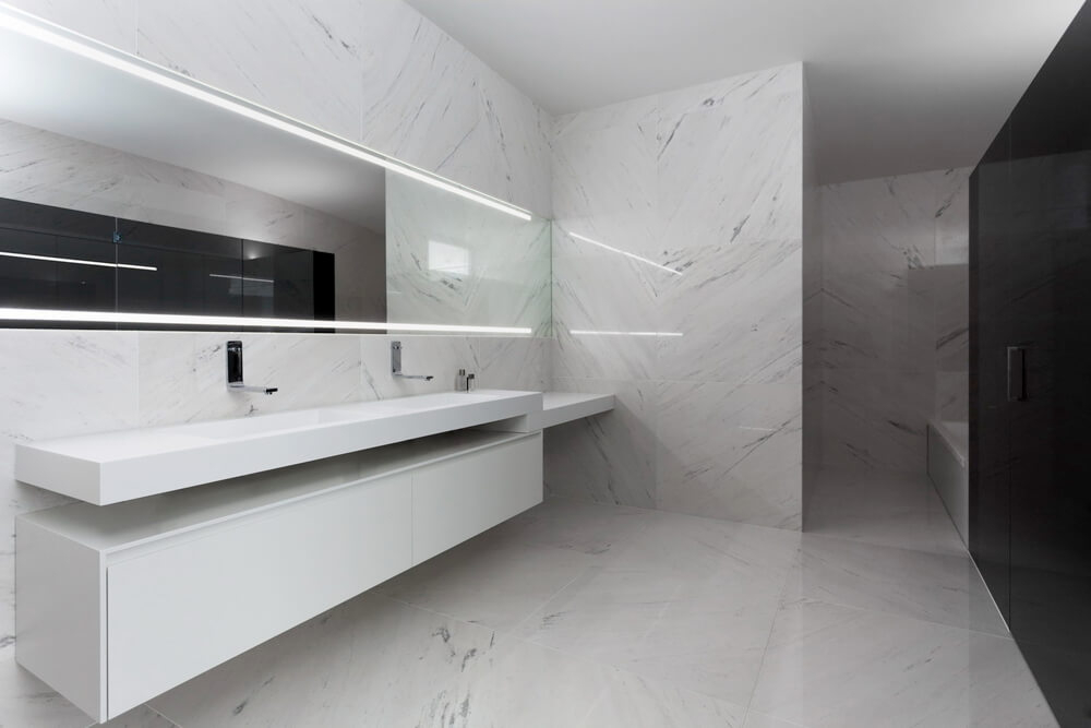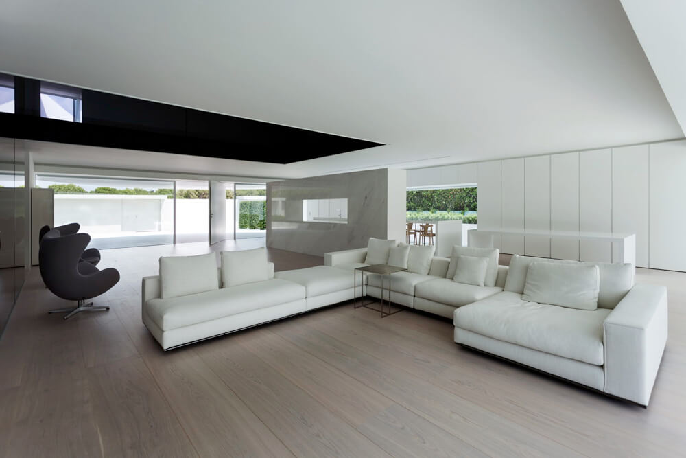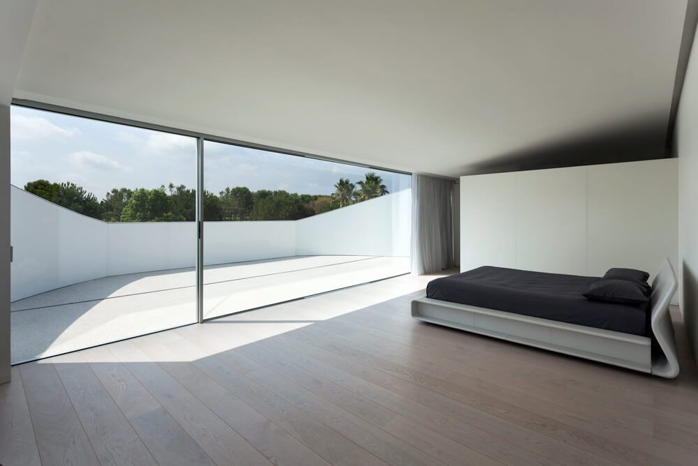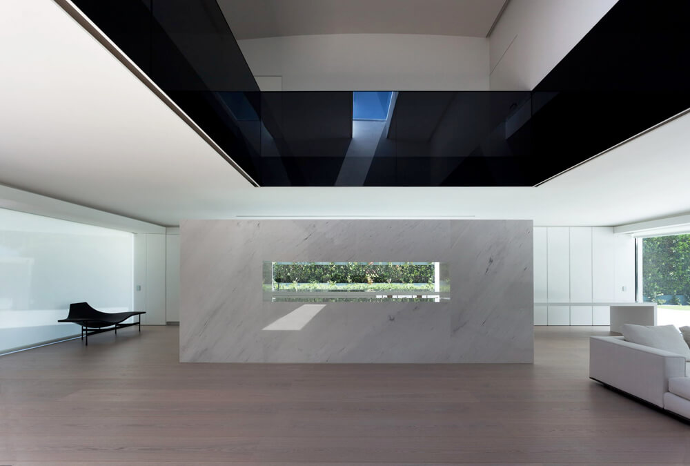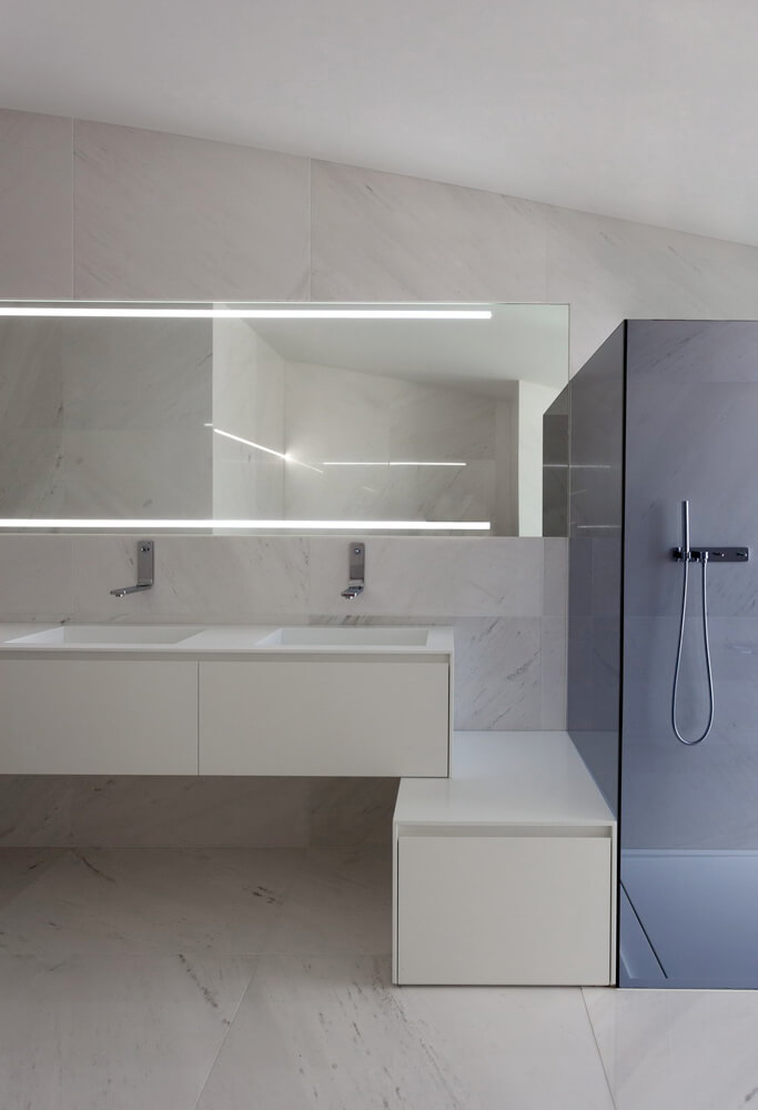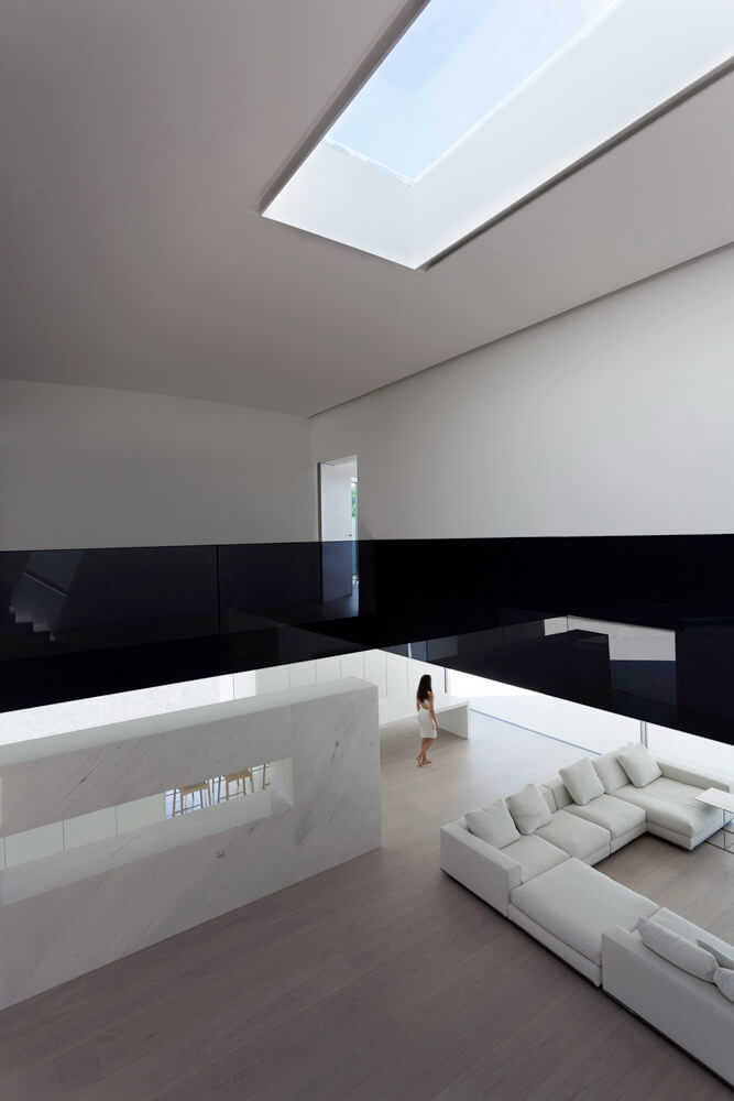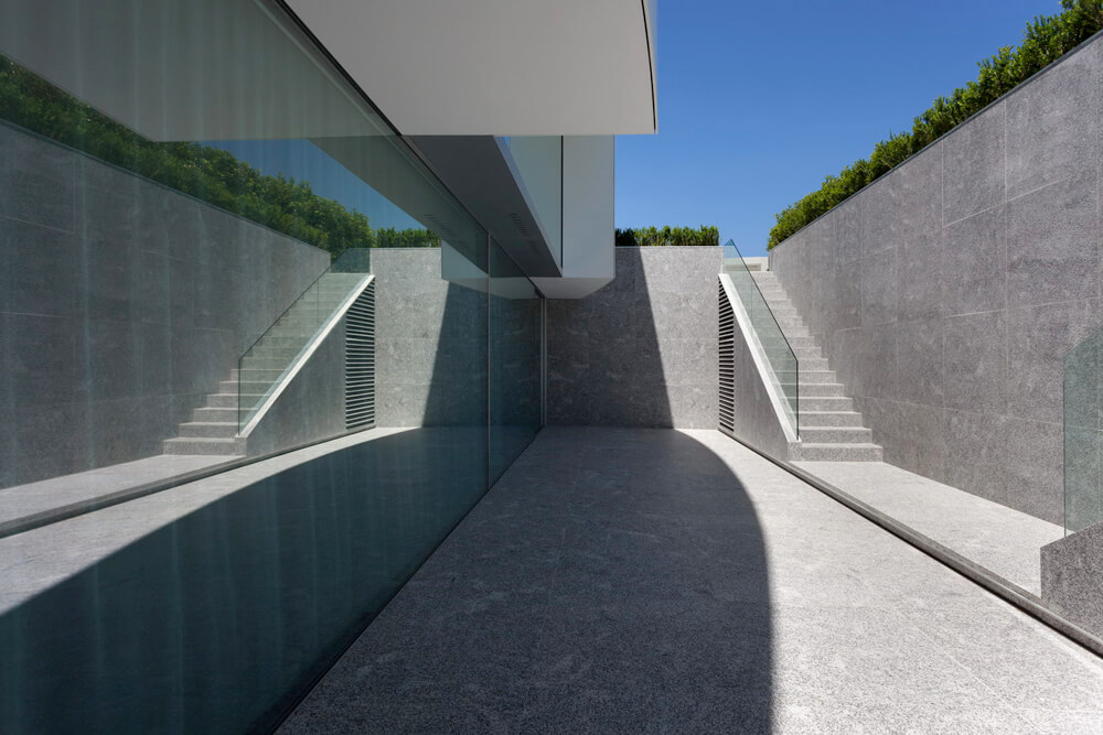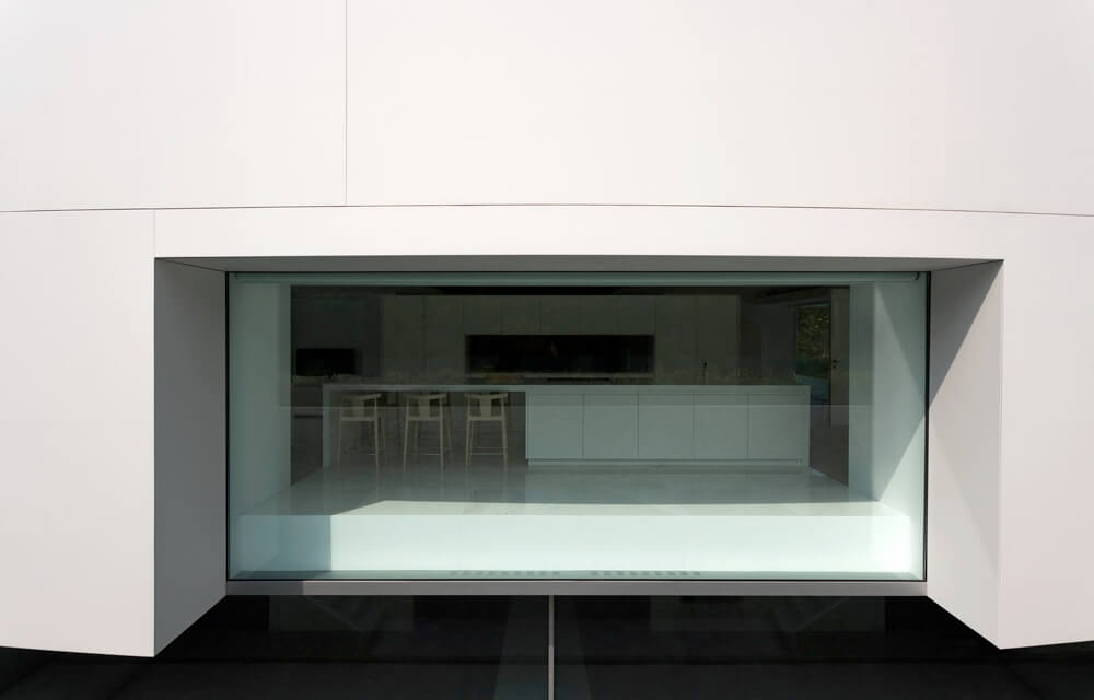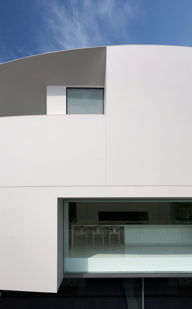 Four concrete supports on the lower floor hold the arched roof, from which the room’s floor hangs. This structure is covered by a monolithic, ventilated façade, which is realized with a Solid Surface with a simple curve that doesn’t require thermoforming to adapt to the geometry of the piece. The rest of materials used in the construction range from white to black, covering all scales of grey.