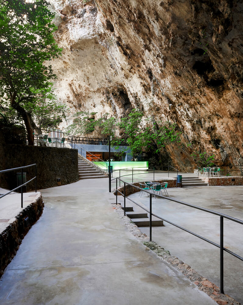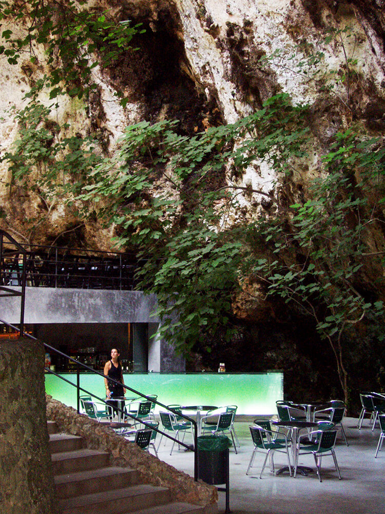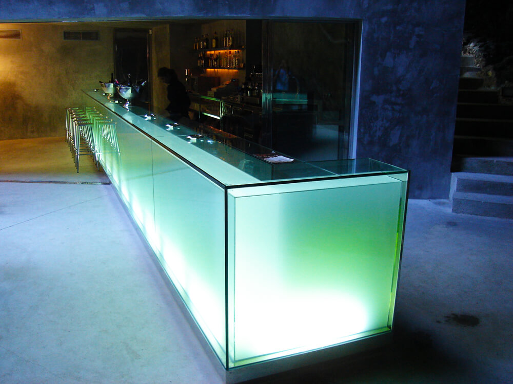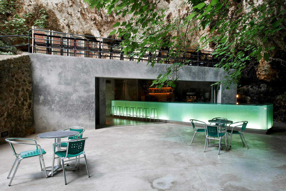 A lush botanic garden is housed at the great natural entrance to the Caves of Hams in Mallorca. It is at this entrance that the bar is situated and made up of a piece of backlit glass of 10 meters in length.