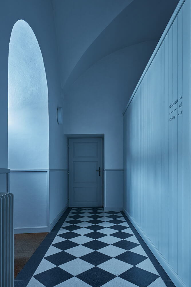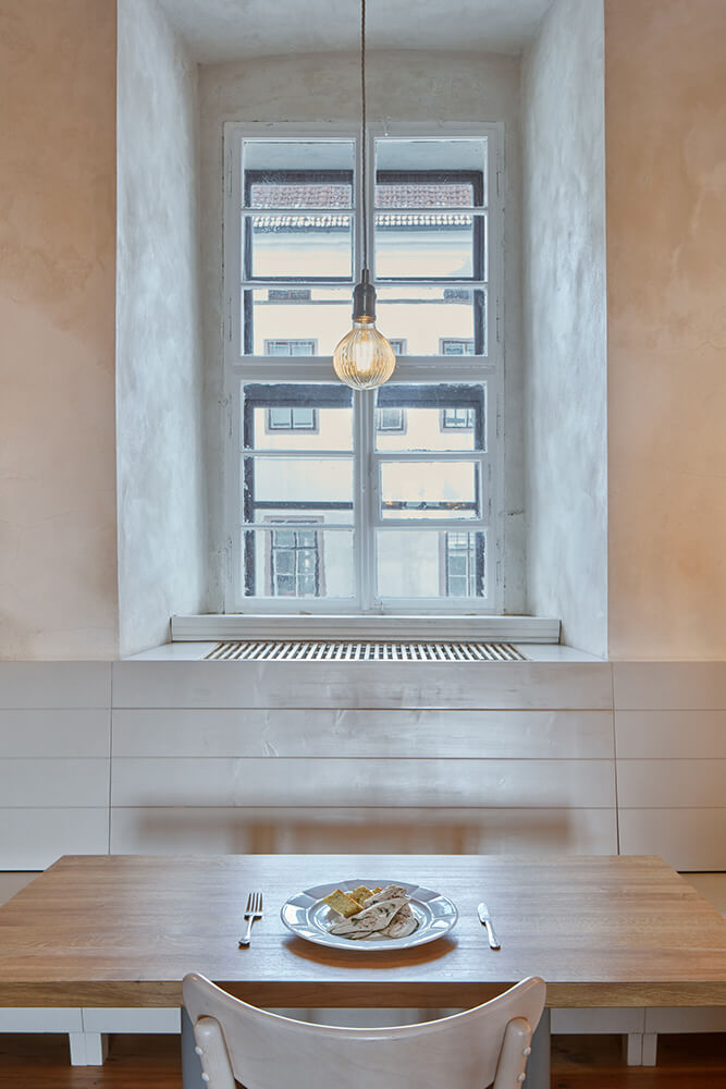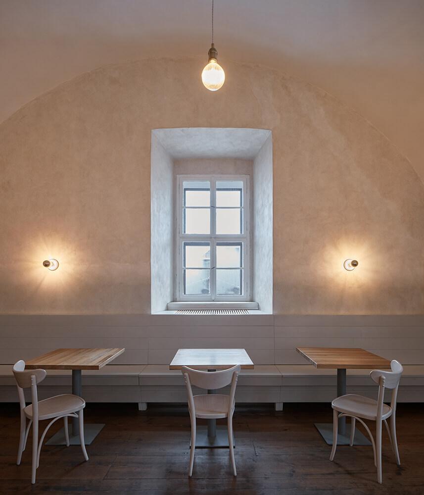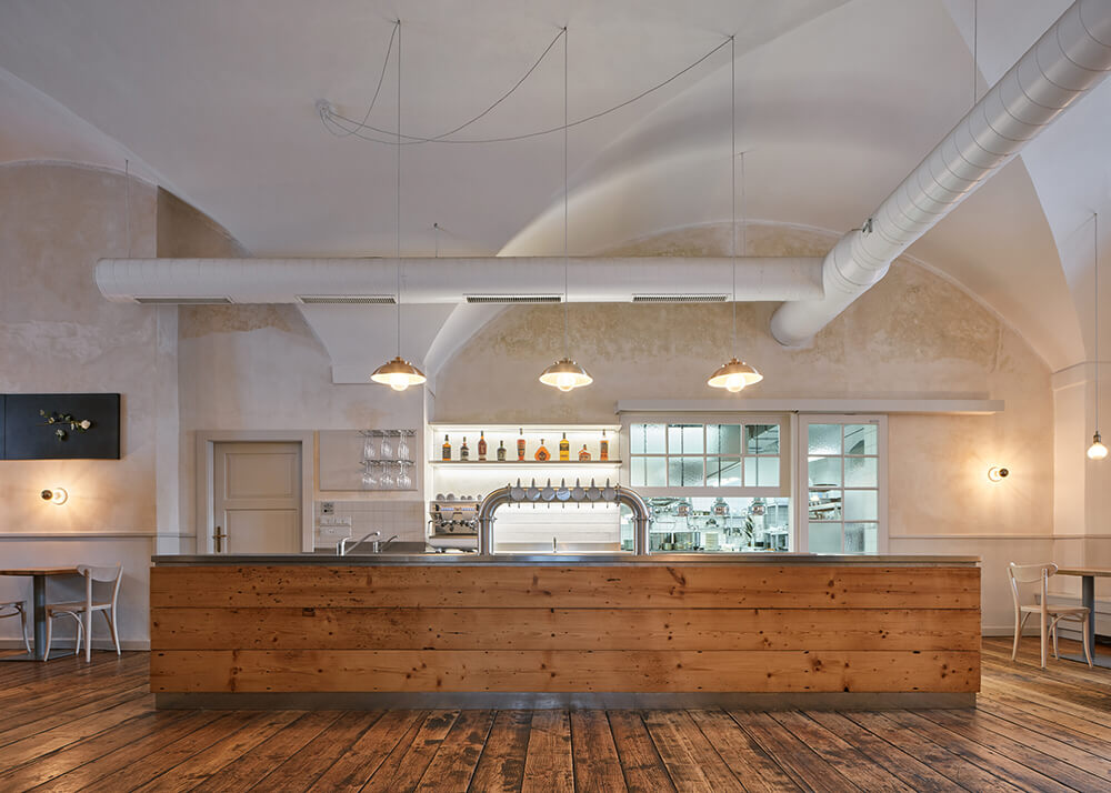 The overarching atmosphere of the interior is defined by the elegant curves of the original arched structures. Following the possibility to refurbish the original plank floor, the interior incorporates this reused material, for example, as the veneer of the bar counters. Another interesting feature of the interior is expressed by the use of the original layers of paint, which creates a natural patina along the perimeter walls. Dividing the restaurant and the kitchen is a traditional windowpane allowing for a small peek into the kitchen. There are also refurbished items like the original tile stove, stone mouldings and a number of tiny little windows and doors found in unexpected positions.