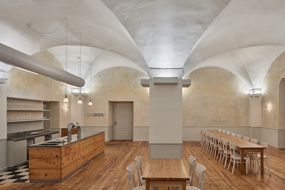 The restaurant symbolically refers back to the original pub, which existed in the same location from the seventeenth to the early twentieth century. The past century however, was marked by the typical attitude of the communist regime towards the cultural heritage of properties, and had unfortunately left its scars on the building. The monastery was left to decay and was affected by a series of unprofessional adjustments which were typical of the era. The investor requested a renovation to liven up the space by returning it to its original function – serving food and drinks.