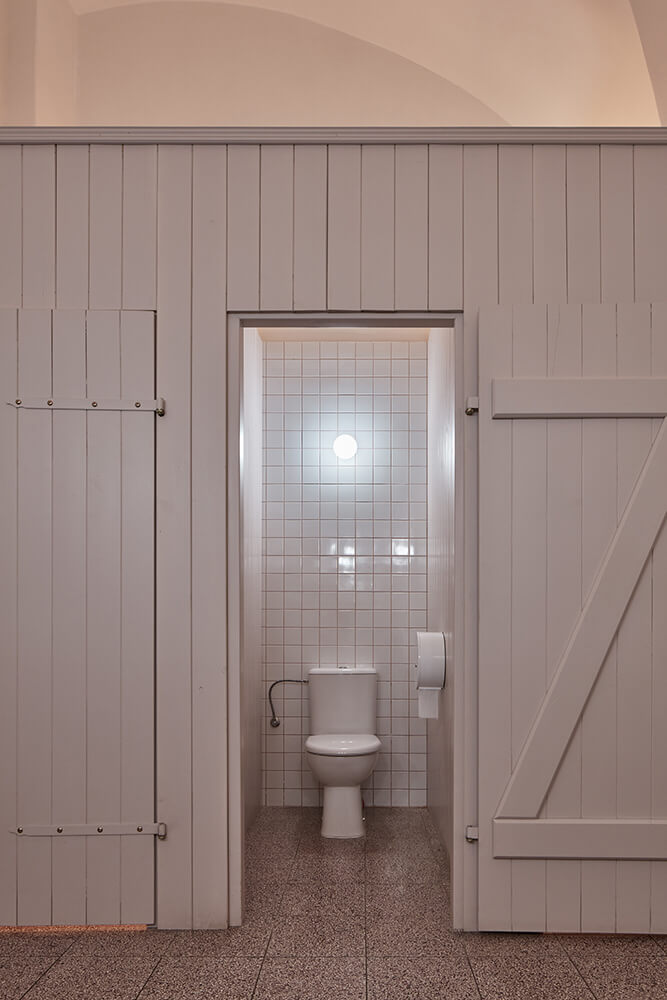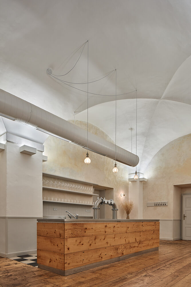 The corridor’s floors feature terrazzo tiles with a striking chessboard pattern from a Czech producer. The low built-in toilet stalls fill out the arched spaces, enabling the original arches to remain airy and visible. A significant element of the interior is the preserved original casement windows and panelled doors with massive doorframes. Historically valuable items have been refurbished, and other items have been recreated as replicas. The lighting and other essential technical items have been designed to minimally interfere with the overall look of the interior. Complemented by the wooden oak tables the wall panelling and seating furniture feature a neutral light grey colour. The use of wooden materials and the airy, sparsely furnished vaulted spaces bring the experience of tasting the traditional local menu to the next level.