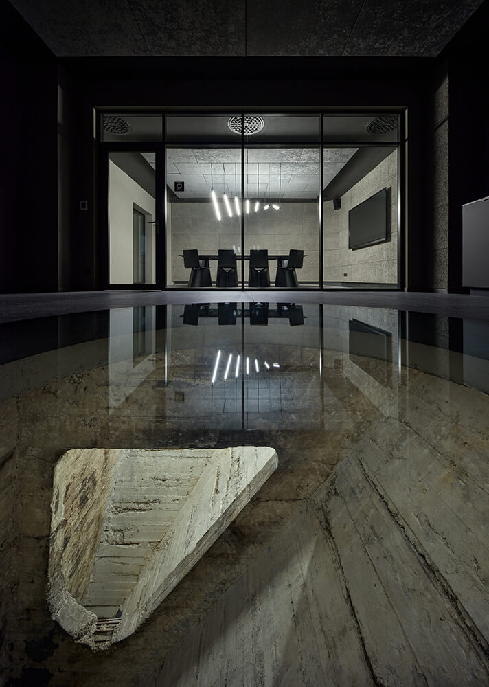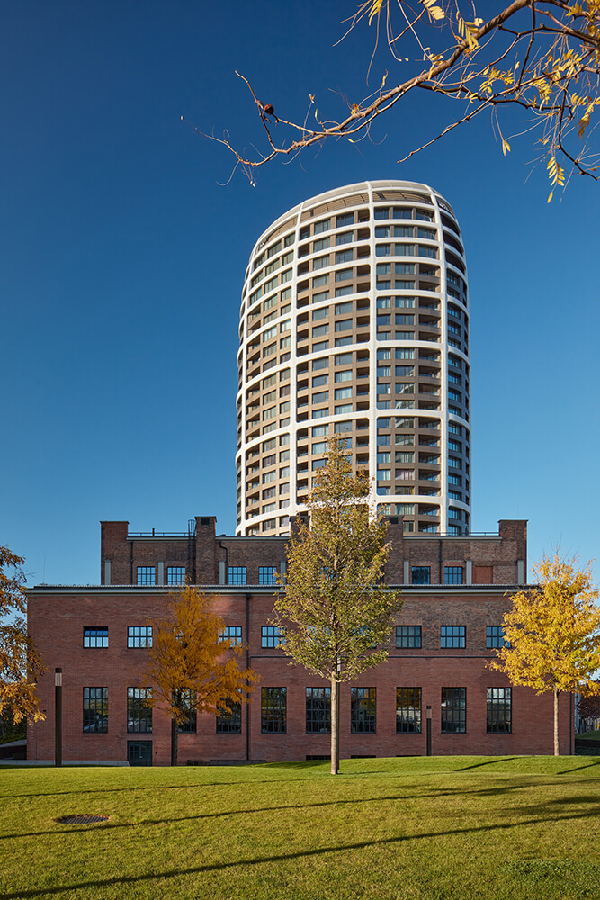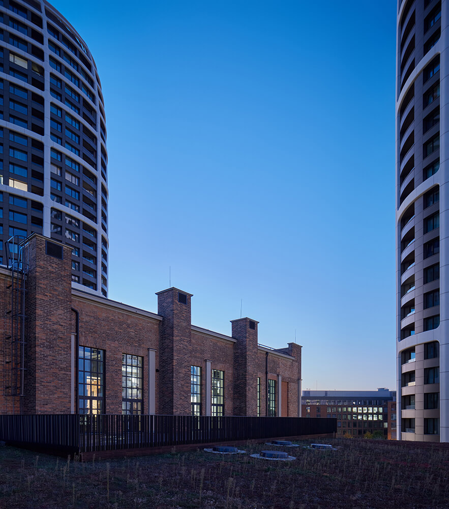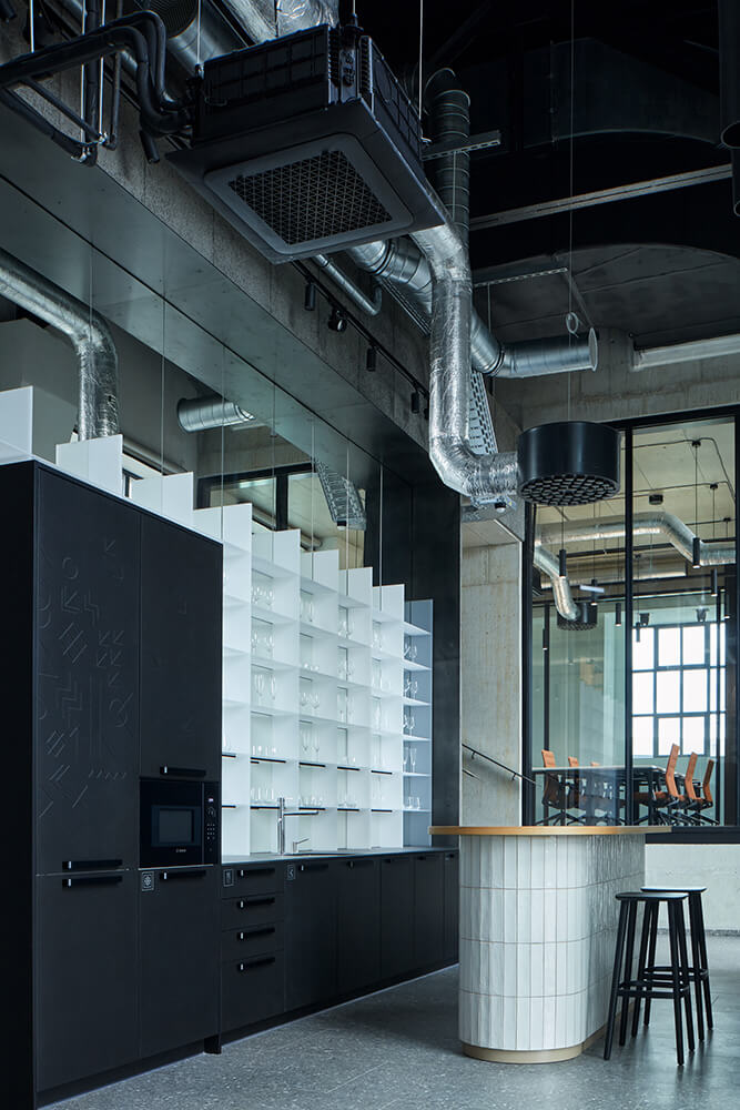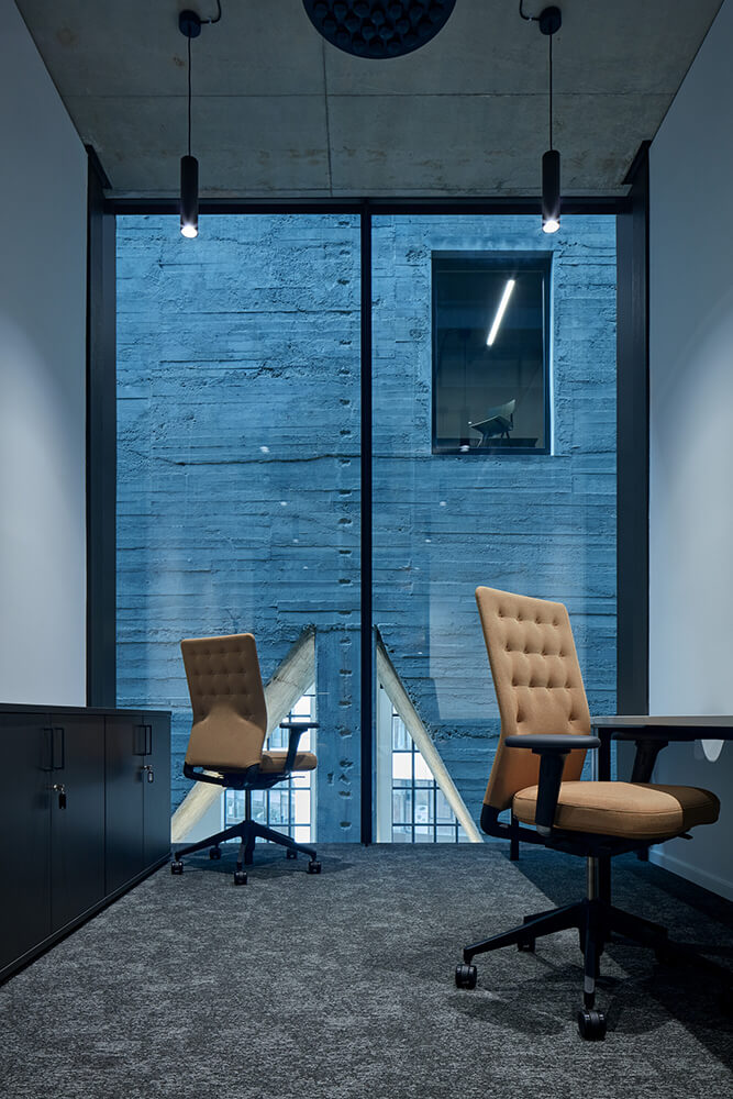 DF Creative Group placed a new five-storey building in the interior of the boiler and turbine hall, which created new areas. Their architectural solution uses the free internal space in the boiler and turbine halls to incorporate new independent structures. This concept makes it possible to clearly separate and distinguish the historic structures from the new ones. Other industrial elements of the heating plant were also used to pay homage to history – the entire interior is dominated by concrete hoppers, with the original crane forming the atypical open ceiling of the shared office.