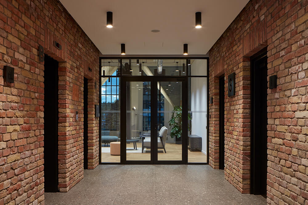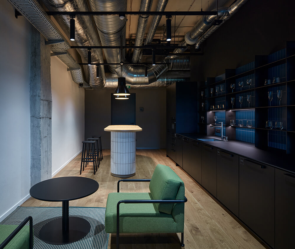 The transformation of the industrial monument into a comfortable workspace also depends on appropriate materials. The colour palette is based on the shades of terracotta, characteristic of the building’s shell, complemented by muted deep tones of blue, green and carbon black. The ceilings remain open, while the floors in the common zones accentuate the wood or large-format ceramic tiles.
