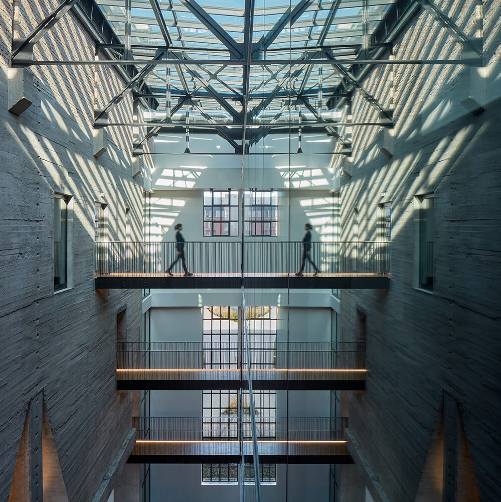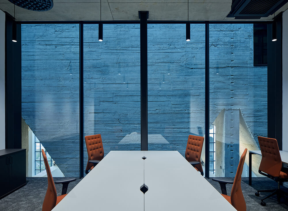 The generosity of the space is underlined by the massive concrete hoppers, which were originally used to store solid fuels. The architects managed to place some of the meeting rooms inside them. The most popular for users so far seems to be the two meeting rooms on the fifth floor. “This is where we took advantage of the location and experimented with glazing in parts of the floor. The result is an iconic space that everyone wants to see. Even those who are afraid of heights,” says architect Antal.