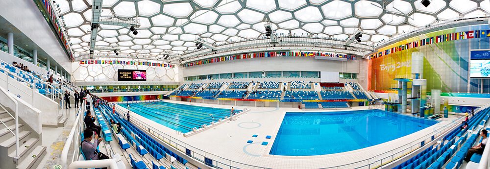 Watercube has a structure that is energy efficient by maximising natural light and capturing solar energy to heat the interior spaces as well as the pools. Rainwater harvesting, recycling, efficient filtration and backwash systems are achieving water efficiency.