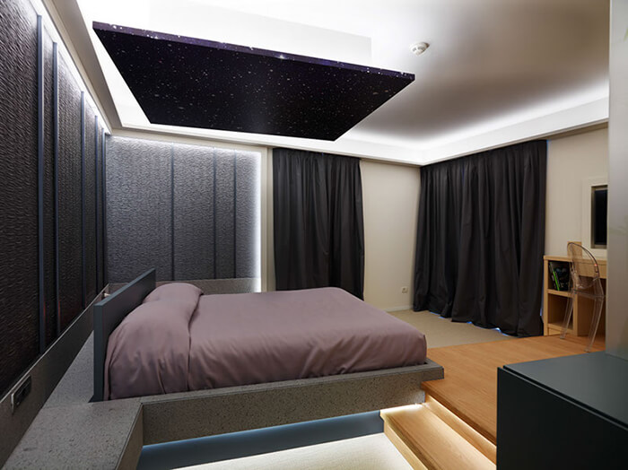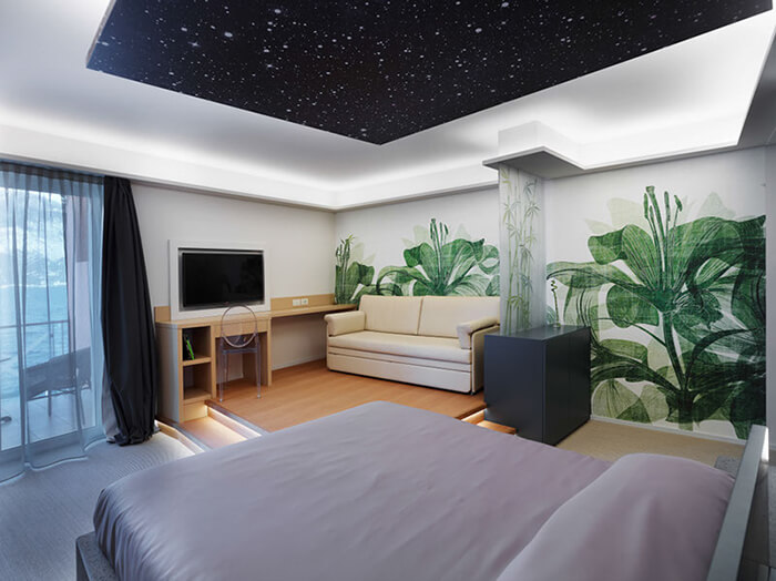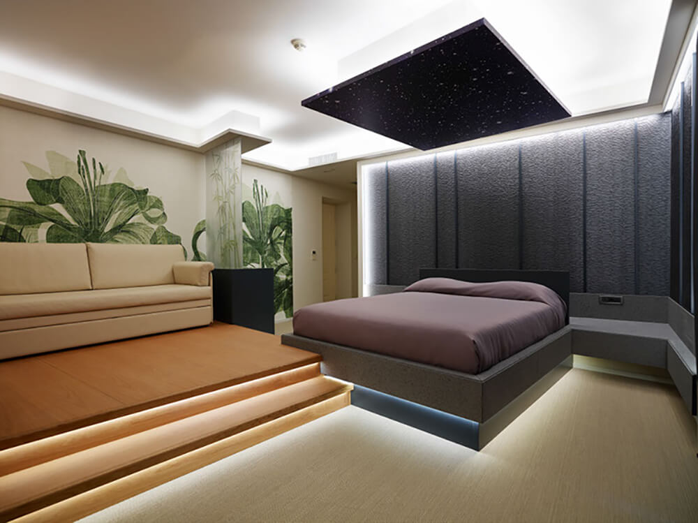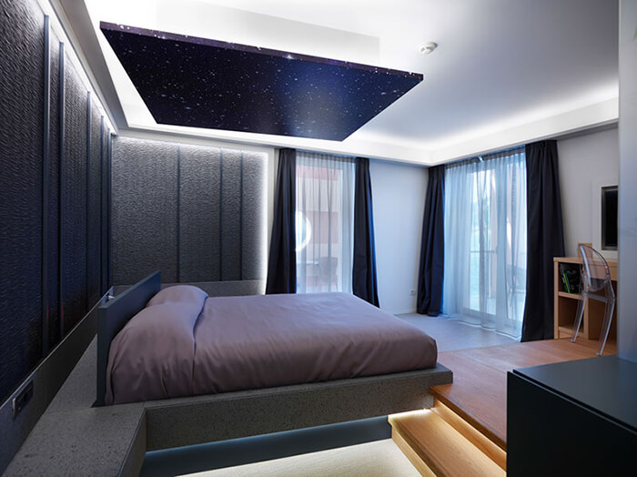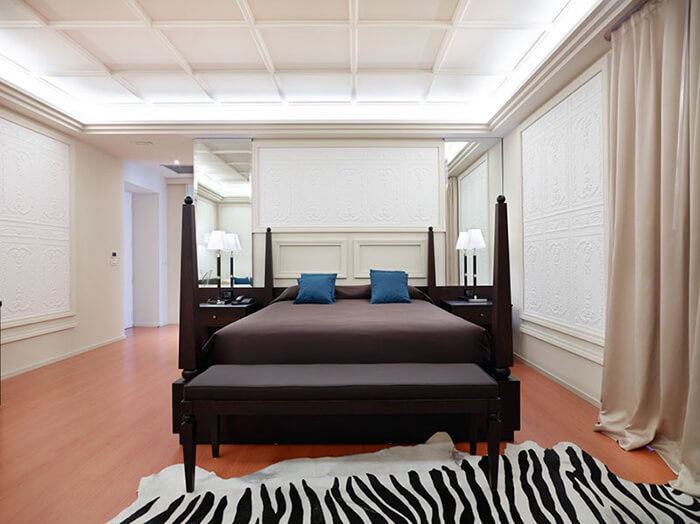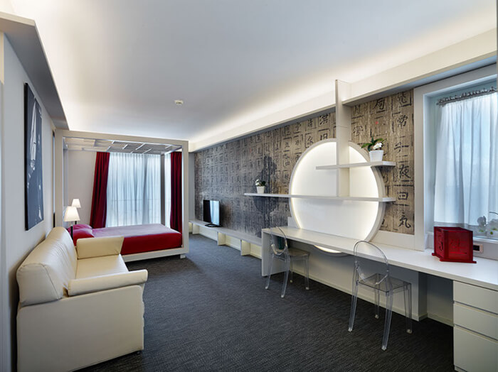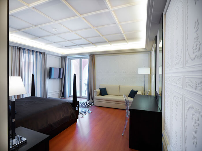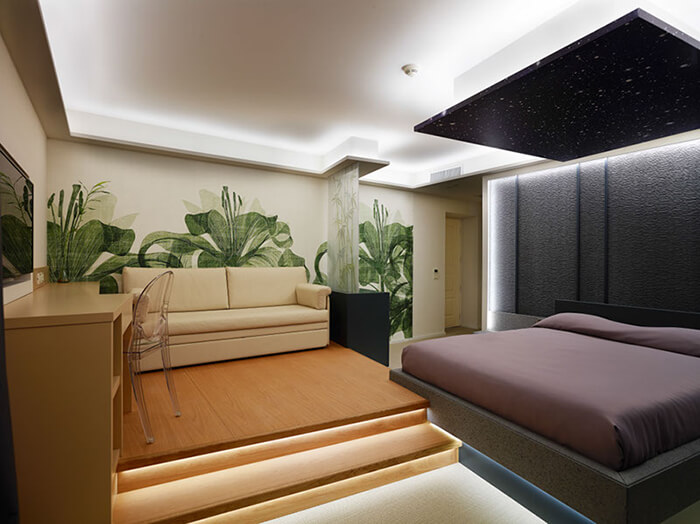 These features have been enhanced, at project, through the use of rounded shapes, like the bed painted white, the back wall containing niches, some chairs and three large circular elements that create the elegant ceiling.