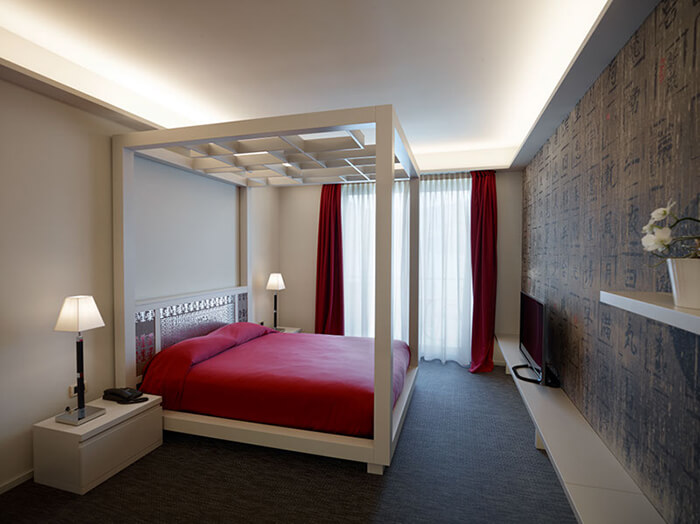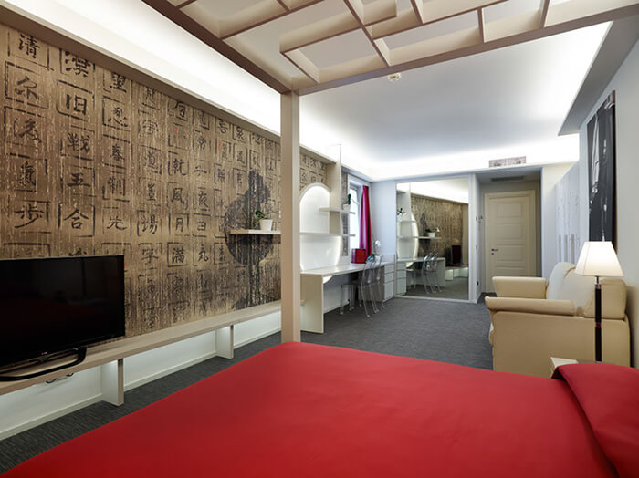 The graphics chosen for this suite incorporates an impressive cascade of earth and sand that seems to cover the whole room with its beige and its ocher. The property then wanted to create some caskets that will collect samples of the famous land (Sienna, Verona, Herculaneum etc.). Particular, the inclusion of some light elements in the horizontal wainscoting behind the bed made of wood.