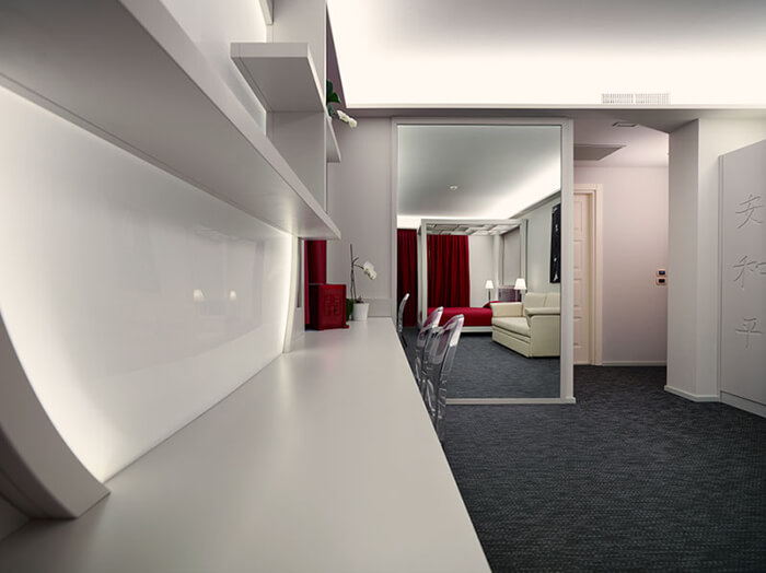 Pitta Suite – consisting of fire and water, is the dosha related to processing, digestion understood both physically and mental. The room is dominated by the red fire graphic. The verticality of the flame is counterbalanced by a particular piece of aluminum that goes out from the wall to “stick” in red glass table supporting the TV in the middle of the suite.