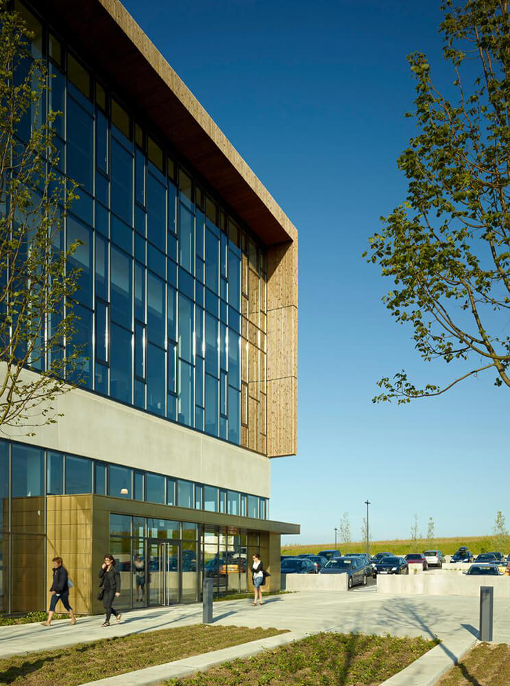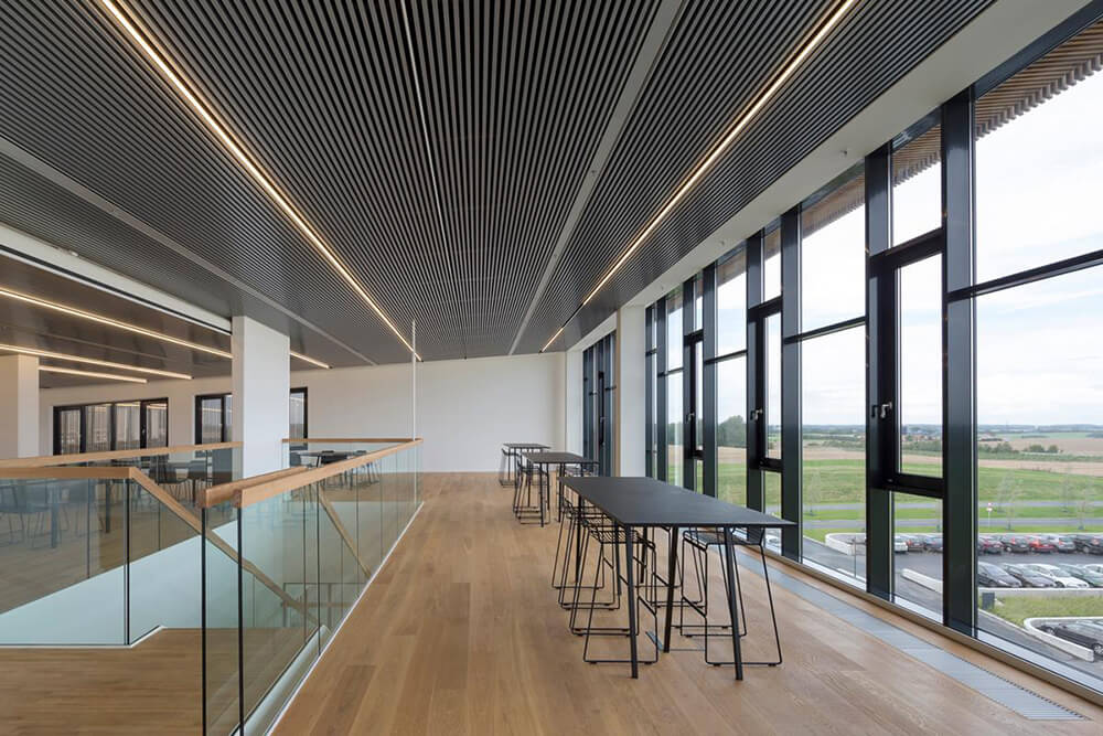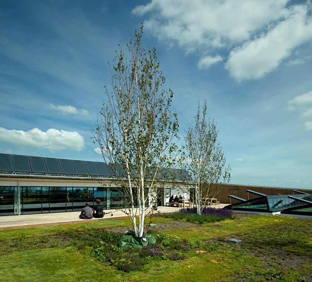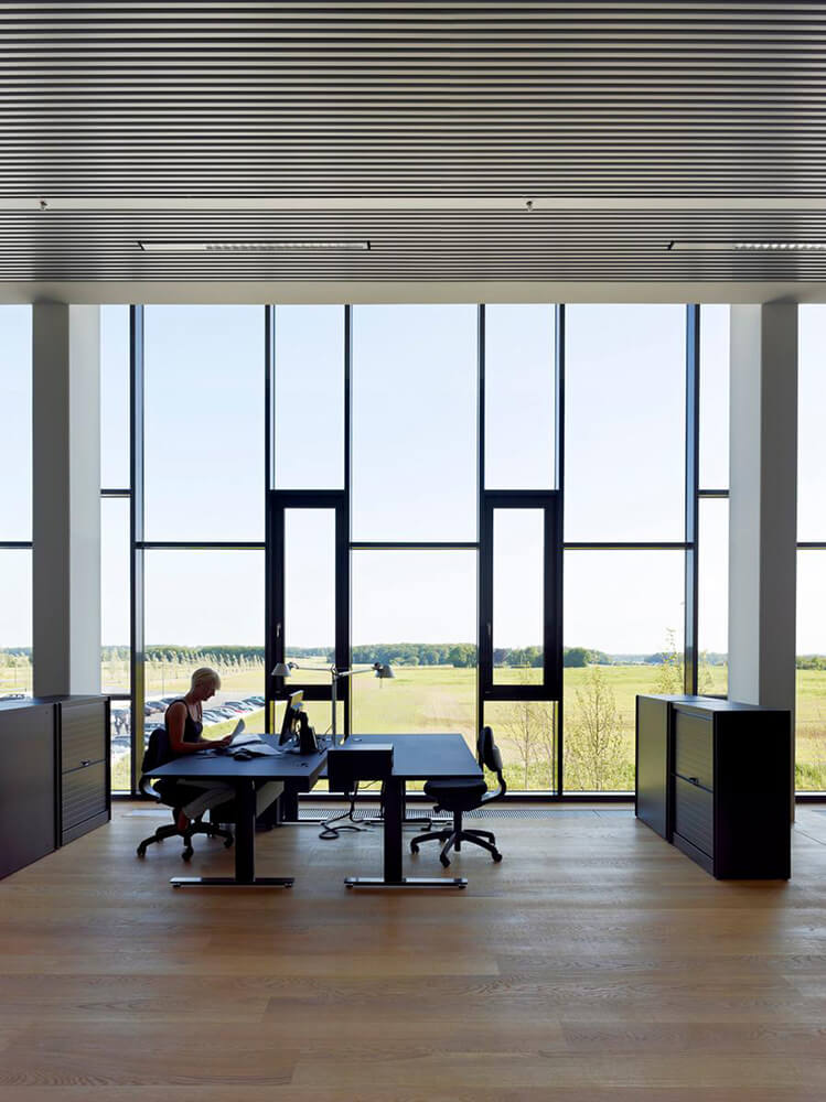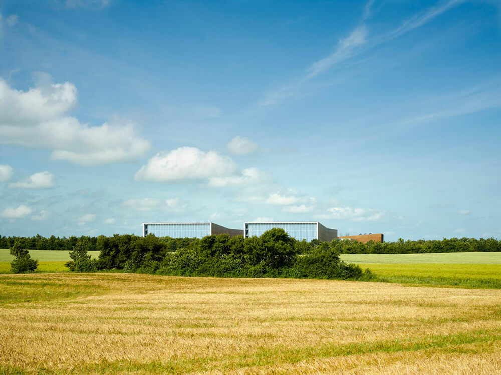 Throughout the building, emphasis has been placed on creating pleasant and safe workplaces, allowing daylight to enter, and on creating an intimacy with the landscape and the views, including the surrounding site covering approximately 65ha which has been designed to uphold and recreate the ecological values of the original site as a natural area with oak woods, wetlands and meadows with grazing cows as a fertile environment for a rich flora and fauna.