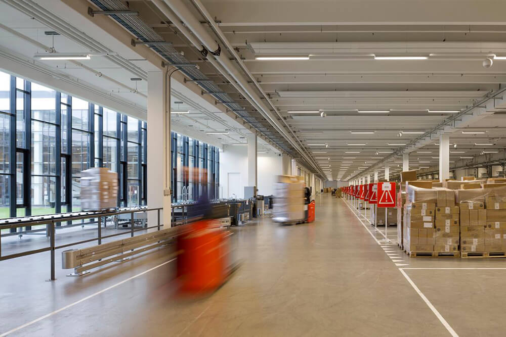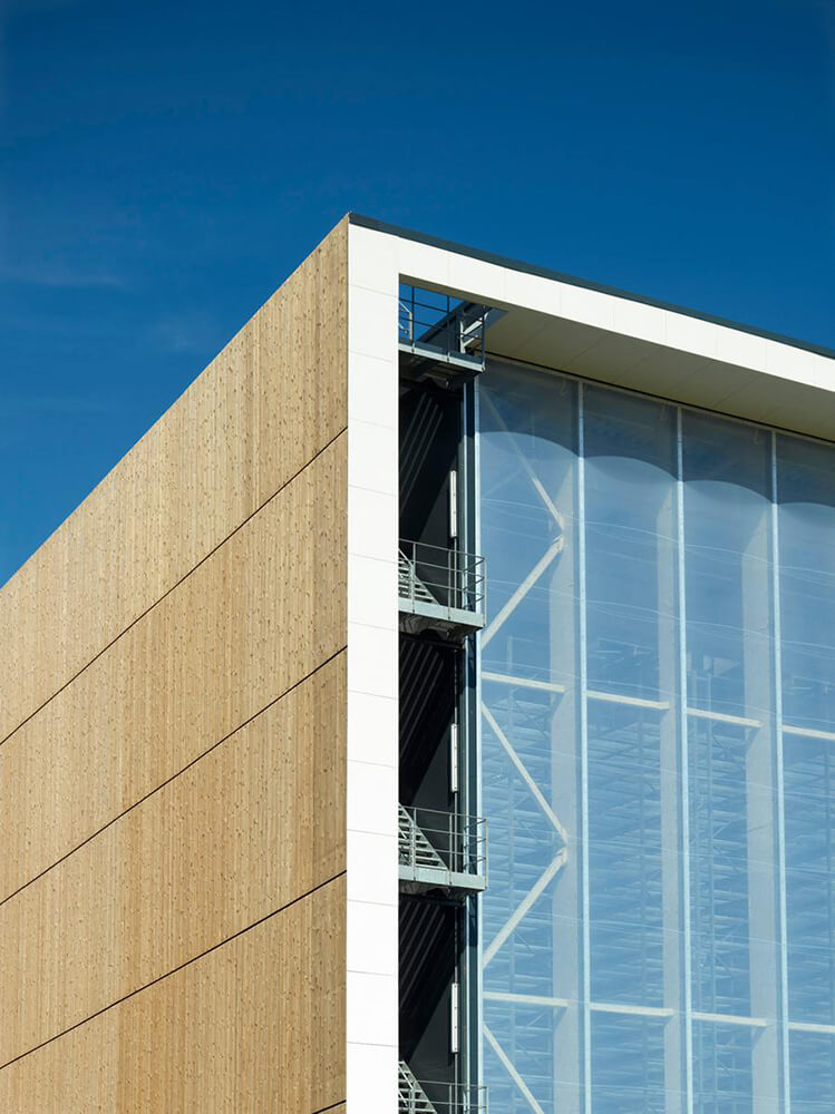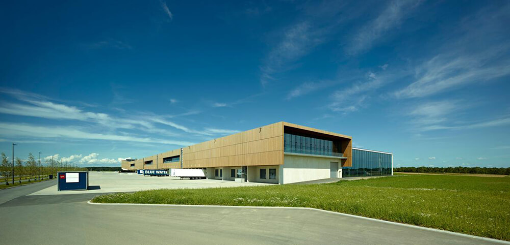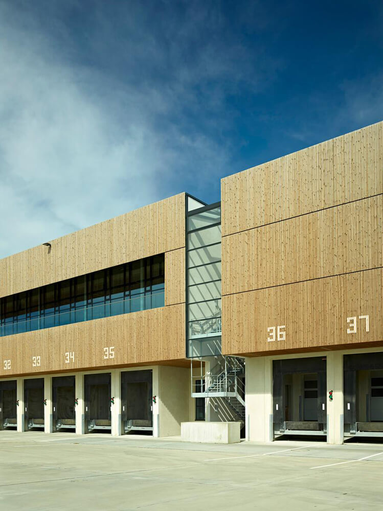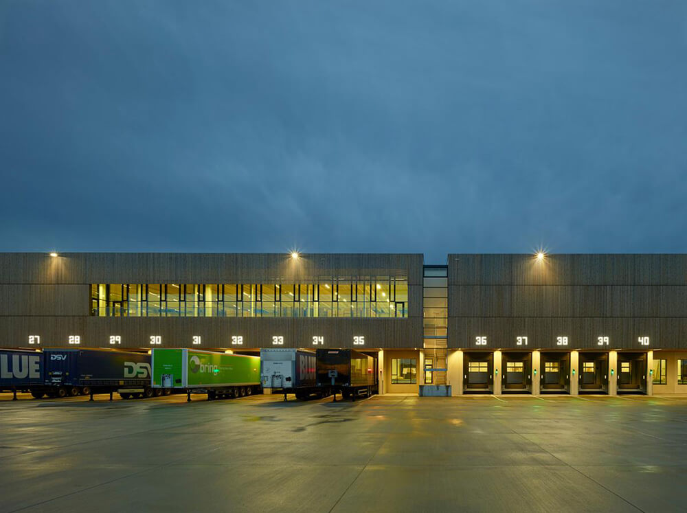 The idea was to create an industrial building that would go beyond the typical standardised solutions for logistic facilities, and create a building with a strong identity that would add an experiential quality to its surrounding. From the motorway can be seen the centre’s two tall mini-load warehouses, each measuring approximately 6,000m², towering up as distinctive silhouettes. They resemble sculptures in the landscape, with simple facades clad in narrow, vertical strips of pine – an enormous construction which nonetheless, thanks to its wooden facade, seems human and approachable. The warehouses have for example transparent gables which provide a glimpse of the cranes inside at work.