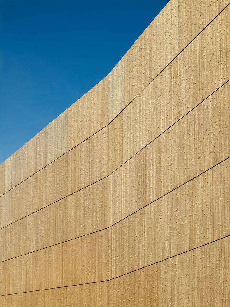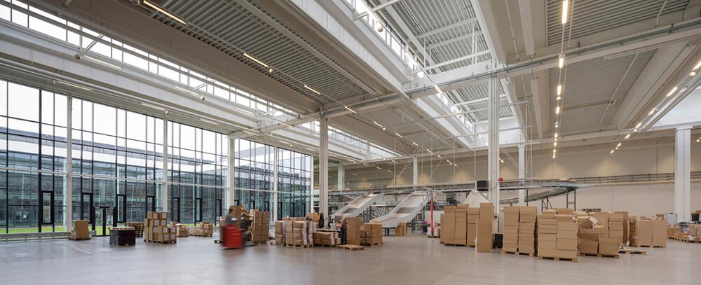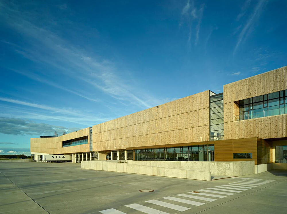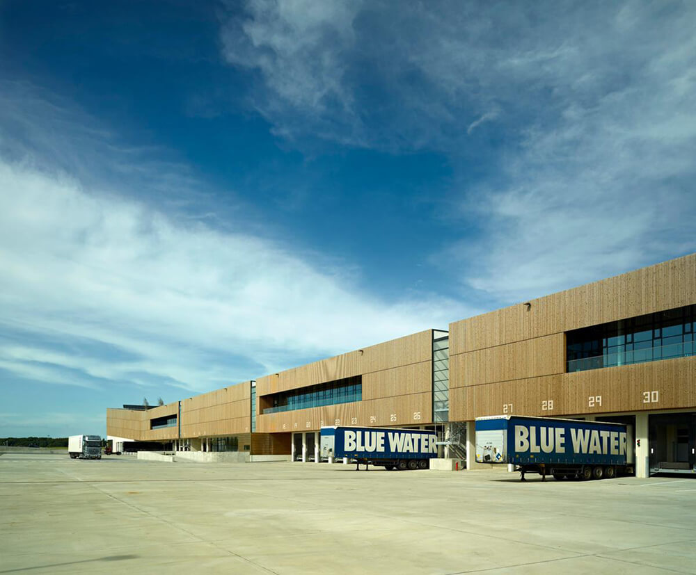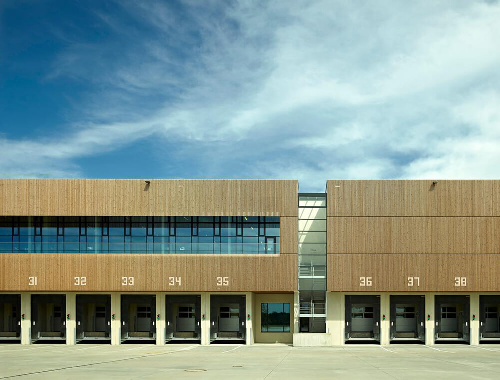 The idea was to create an industrial building that would go beyond the typical standardised solutions for logistic facilities, and create a building with a strong identity that would add an experiential quality to its surrounding. From the motorway can be seen the centre’s two tall mini-load warehouses, each measuring approximately 6,000m², towering up as distinctive silhouettes. They resemble sculptures in the landscape, with simple facades clad in narrow, vertical strips of pine – an enormous construction which nonetheless, thanks to its wooden facade, seems human and approachable. The warehouses have for example transparent gables which provide a glimpse of the cranes inside at work.