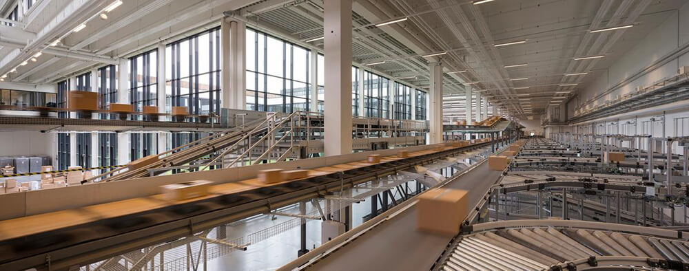 The centre has been planned to occupy three parallel bands surrounding a main avenue. One of these bands contains the main entrance, office and staff facilities, together with an area with loading ramps for trucks, while the second contains an automated sorting facility, and the third fully-automated mini-load stores. The planned layout provides the most flexible arrangement, and allows for a possible future expansion of the logistics centre to triple size, i.e. 150.000m².