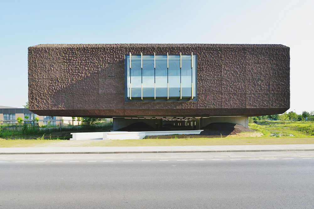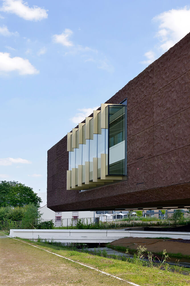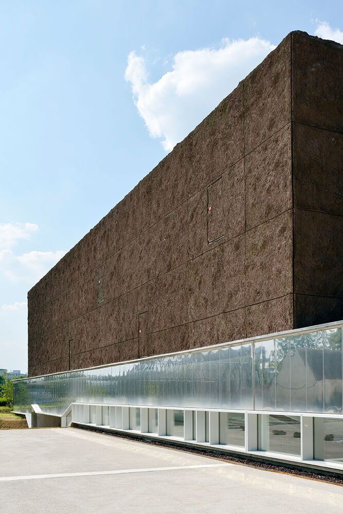 Positioned along the horizontal line of the existing gutters, the two parts of the building are marked and differentiated. The lower part (reception) recreates a frontality with the other part of the preserved Farm. Simple and rectilinear, it drops down towards the moat and becomes the support of the upper part (reading rooms). Suspended telluric volume, as though torn out of its natural element, it extends out on the garden side, pierced by projecting golden glass inclusions and patios which bring natural lighting from underneath.