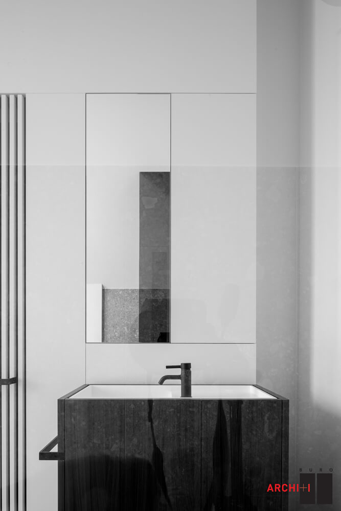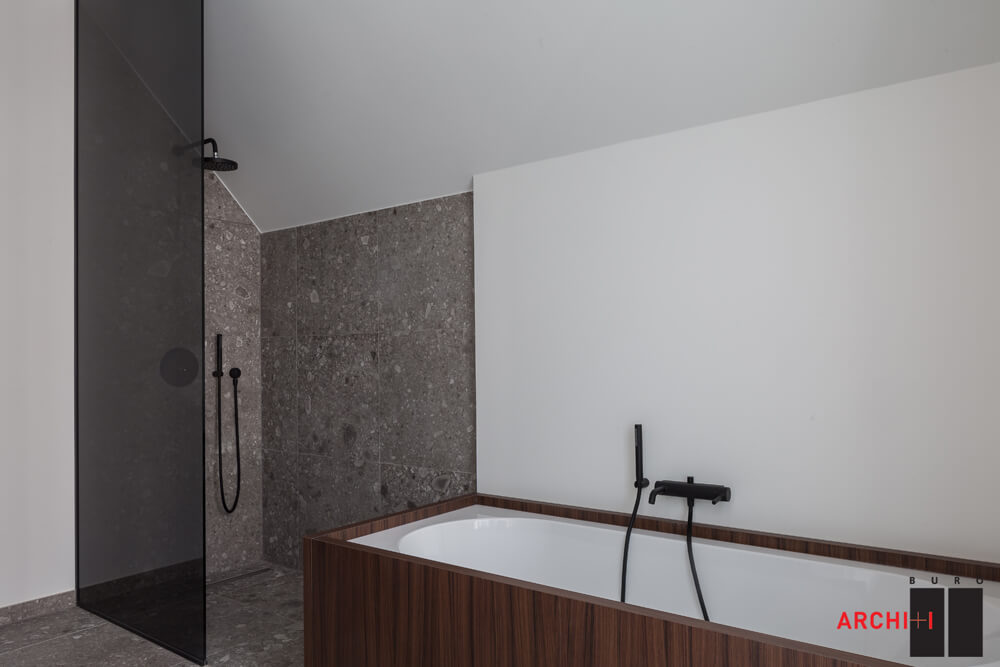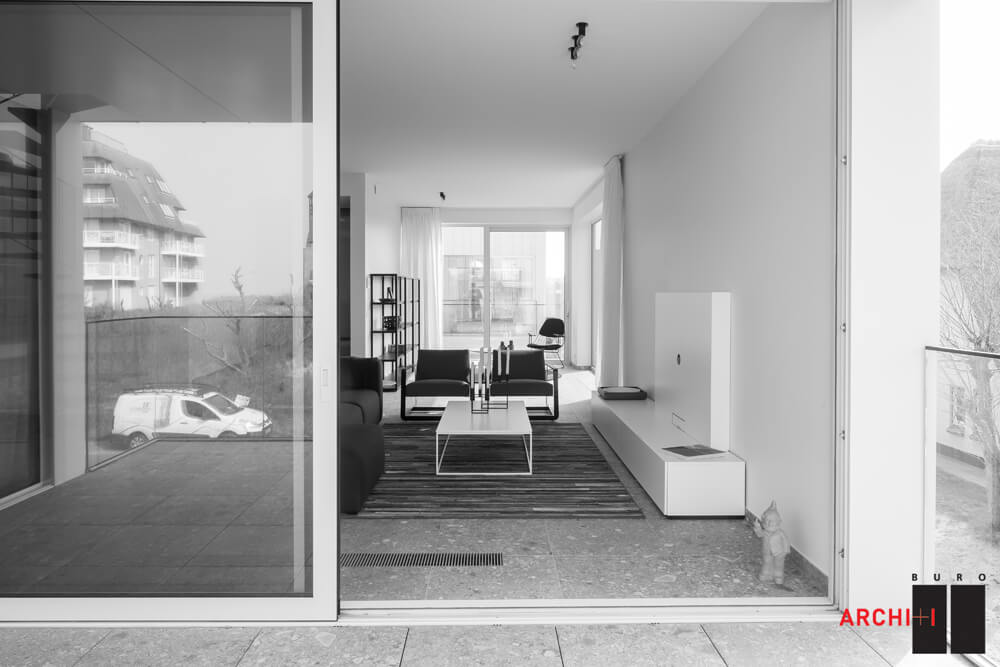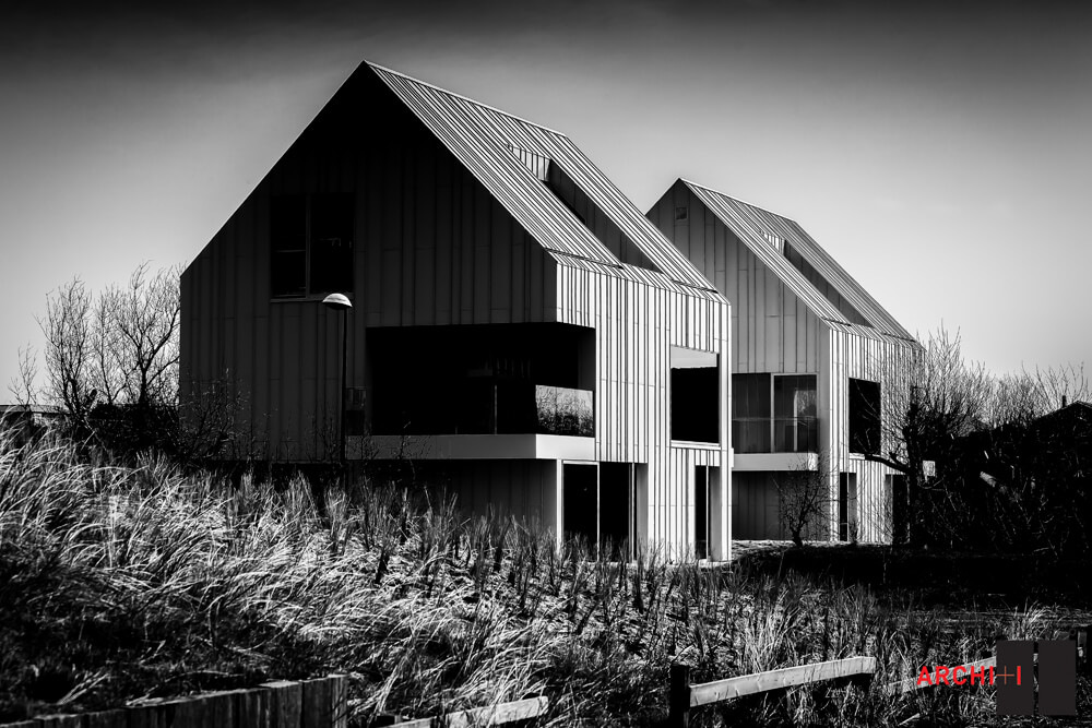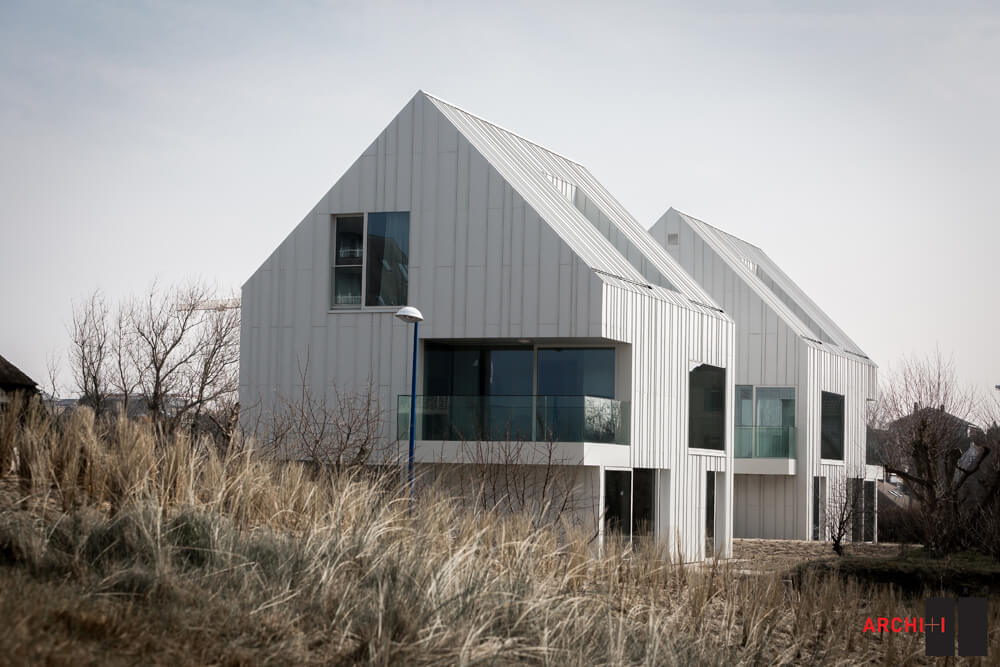 Due to its scale, purity and simplicity in terms of volume, façade composition, details and use of materials, the buildings blend effortlessly into their surroundings. The open space is planted with dune grasses, through which a path meanders to the entrance and terraces of the ground floor apartments.